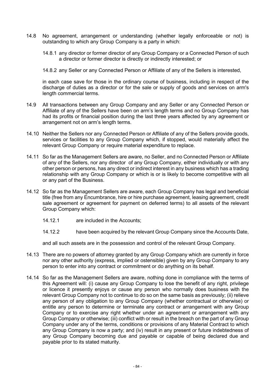 - 84 - 14.8 No agreement, arrangement or understanding (whether legally enforceable or not) is outstanding to which any Group Company is a party in which: 14.8.1 any director or former director of any Group Company or a Connected Person of such a director or former director is directly or indirectly interested; or 14.8.2 any Seller or any Connected Person or Affiliate of any of the Sellers is interested, in each case save for those in the ordinary course of business, including in respect of the discharge of duties as a director or for the sale or supply of goods and services on arm's length commercial terms. 14.9 All transactions between any Group Company and any Seller or any Connected Person or Affiliate of any of the Sellers have been on arm’s length terms and no Group Company has had its profits or financial position during the last three years affected by any agreement or arrangement not on arm’s length terms. 14.10 Neither the Sellers nor any Connected Person or Affiliate of any of the Sellers provide goods, services or facilities to any Group Company which, if stopped, would materially affect the relevant Group Company or require material expenditure to replace. 14.11 So far as the Management Sellers are aware, no Seller, and no Connected Person or Affiliate of any of the Sellers, nor any director of any Group Company, either individually or with any other person or persons, has any direct or indirect interest in any business which has a trading relationship with any Group Company or which is or is likely to become competitive with all or any part of the Business. 14.12 So far as the Management Sellers are aware, each Group Company has legal and beneficial title (free from any Encumbrance, hire or hire purchase agreement, leasing agreement, credit sale agreement or agreement for payment on deferred terms) to all assets of the relevant Group Company which: 14.12.1 are included in the Accounts; 14.12.2 have been acquired by the relevant Group Company since the Accounts Date, and all such assets are in the possession and control of the relevant Group Company. 14.13 There are no powers of attorney granted by any Group Company which are currently in force nor any other authority (express, implied or ostensible) given by any Group Company to any person to enter into any contract or commitment or do anything on its behalf. 14.14 So far as the Management Sellers are aware, nothing done in compliance with the terms of this Agreement will: (i) cause any Group Company to lose the benefit of any right, privilege or licence it presently enjoys or cause any person who normally does business with the relevant Group Company not to continue to do so on the same basis as previously; (ii) relieve any person of any obligation to any Group Company (whether contractual or otherwise) or entitle any person to determine or terminate any contract or arrangement with any Group Company or to exercise any right whether under an agreement or arrangement with any Group Company or otherwise; (iii) conflict with or result in the breach on the part of any Group Company under any of the terms, conditions or provisions of any Material Contract to which any Group Company is now a party; and (iv) result in any present or future indebtedness of any Group Company becoming due and payable or capable of being declared due and payable prior to its stated maturity.