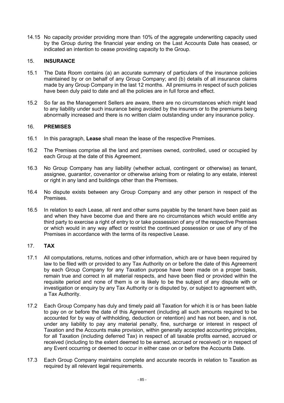 - 85 - 14.15 No capacity provider providing more than 10% of the aggregate underwriting capacity used by the Group during the financial year ending on the Last Accounts Date has ceased, or indicated an intention to cease providing capacity to the Group. 15. INSURANCE 15.1 The Data Room contains (a) an accurate summary of particulars of the insurance policies maintained by or on behalf of any Group Company; and (b) details of all insurance claims made by any Group Company in the last 12 months. All premiums in respect of such policies have been duly paid to date and all the policies are in full force and effect. 15.2 So far as the Management Sellers are aware, there are no circumstances which might lead to any liability under such insurance being avoided by the insurers or to the premiums being abnormally increased and there is no written claim outstanding under any insurance policy. 16. PREMISES 16.1 In this paragraph, Lease shall mean the lease of the respective Premises. 16.2 The Premises comprise all the land and premises owned, controlled, used or occupied by each Group at the date of this Agreement. 16.3 No Group Company has any liability (whether actual, contingent or otherwise) as tenant, assignee, guarantor, covenantor or otherwise arising from or relating to any estate, interest or right in any land and buildings other than the Premises. 16.4 No dispute exists between any Group Company and any other person in respect of the Premises. 16.5 In relation to each Lease, all rent and other sums payable by the tenant have been paid as and when they have become due and there are no circumstances which would entitle any third party to exercise a right of entry to or take possession of any of the respective Premises or which would in any way affect or restrict the continued possession or use of any of the Premises in accordance with the terms of its respective Lease. 17. TAX 17.1 All computations, returns, notices and other information, which are or have been required by law to be filed with or provided to any Tax Authority on or before the date of this Agreement by each Group Company for any Taxation purpose have been made on a proper basis, remain true and correct in all material respects, and have been filed or provided within the requisite period and none of them is or is likely to be the subject of any dispute with or investigation or enquiry by any Tax Authority or is disputed by, or subject to agreement with, a Tax Authority. 17.2 Each Group Company has duly and timely paid all Taxation for which it is or has been liable to pay on or before the date of this Agreement (including all such amounts required to be accounted for by way of withholding, deduction or retention) and has not been, and is not, under any liability to pay any material penalty, fine, surcharge or interest in respect of Taxation and the Accounts make provision, within generally accepted accounting principles, for all Taxation (including deferred Tax) in respect of all taxable profits earned, accrued or received (including to the extent deemed to be earned, accrued or received) or in respect of any Event occurring or deemed to occur in either case on or before the Accounts Date. 17.3 Each Group Company maintains complete and accurate records in relation to Taxation as required by all relevant legal requirements.