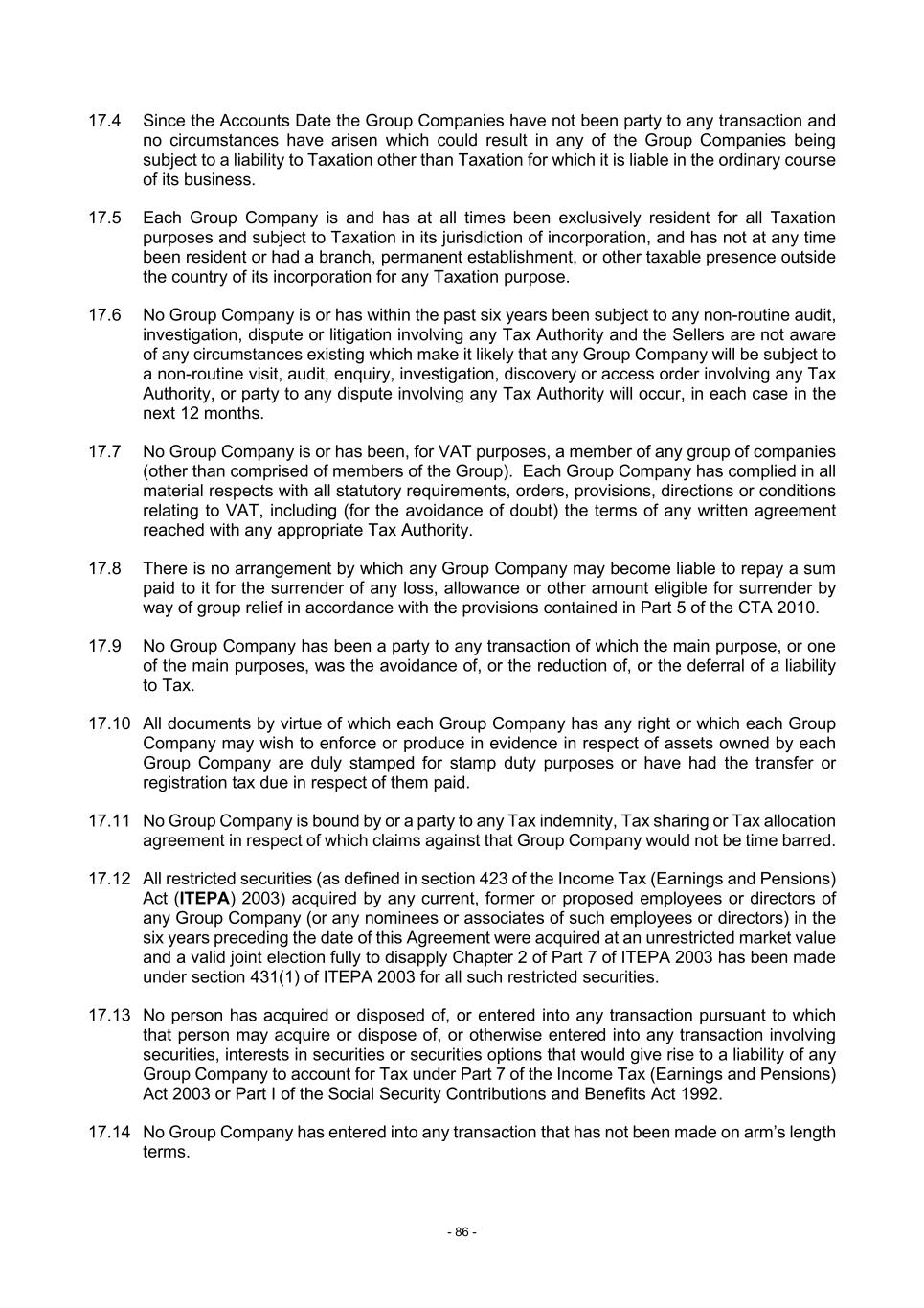 - 86 - 17.4 Since the Accounts Date the Group Companies have not been party to any transaction and no circumstances have arisen which could result in any of the Group Companies being subject to a liability to Taxation other than Taxation for which it is liable in the ordinary course of its business. 17.5 Each Group Company is and has at all times been exclusively resident for all Taxation purposes and subject to Taxation in its jurisdiction of incorporation, and has not at any time been resident or had a branch, permanent establishment, or other taxable presence outside the country of its incorporation for any Taxation purpose. 17.6 No Group Company is or has within the past six years been subject to any non-routine audit, investigation, dispute or litigation involving any Tax Authority and the Sellers are not aware of any circumstances existing which make it likely that any Group Company will be subject to a non-routine visit, audit, enquiry, investigation, discovery or access order involving any Tax Authority, or party to any dispute involving any Tax Authority will occur, in each case in the next 12 months. 17.7 No Group Company is or has been, for VAT purposes, a member of any group of companies (other than comprised of members of the Group). Each Group Company has complied in all material respects with all statutory requirements, orders, provisions, directions or conditions relating to VAT, including (for the avoidance of doubt) the terms of any written agreement reached with any appropriate Tax Authority. 17.8 There is no arrangement by which any Group Company may become liable to repay a sum paid to it for the surrender of any loss, allowance or other amount eligible for surrender by way of group relief in accordance with the provisions contained in Part 5 of the CTA 2010. 17.9 No Group Company has been a party to any transaction of which the main purpose, or one of the main purposes, was the avoidance of, or the reduction of, or the deferral of a liability to Tax. 17.10 All documents by virtue of which each Group Company has any right or which each Group Company may wish to enforce or produce in evidence in respect of assets owned by each Group Company are duly stamped for stamp duty purposes or have had the transfer or registration tax due in respect of them paid. 17.11 No Group Company is bound by or a party to any Tax indemnity, Tax sharing or Tax allocation agreement in respect of which claims against that Group Company would not be time barred. 17.12 All restricted securities (as defined in section 423 of the Income Tax (Earnings and Pensions) Act (ITEPA) 2003) acquired by any current, former or proposed employees or directors of any Group Company (or any nominees or associates of such employees or directors) in the six years preceding the date of this Agreement were acquired at an unrestricted market value and a valid joint election fully to disapply Chapter 2 of Part 7 of ITEPA 2003 has been made under section 431(1) of ITEPA 2003 for all such restricted securities. 17.13 No person has acquired or disposed of, or entered into any transaction pursuant to which that person may acquire or dispose of, or otherwise entered into any transaction involving securities, interests in securities or securities options that would give rise to a liability of any Group Company to account for Tax under Part 7 of the Income Tax (Earnings and Pensions) Act 2003 or Part I of the Social Security Contributions and Benefits Act 1992. 17.14 No Group Company has entered into any transaction that has not been made on arm’s length terms.