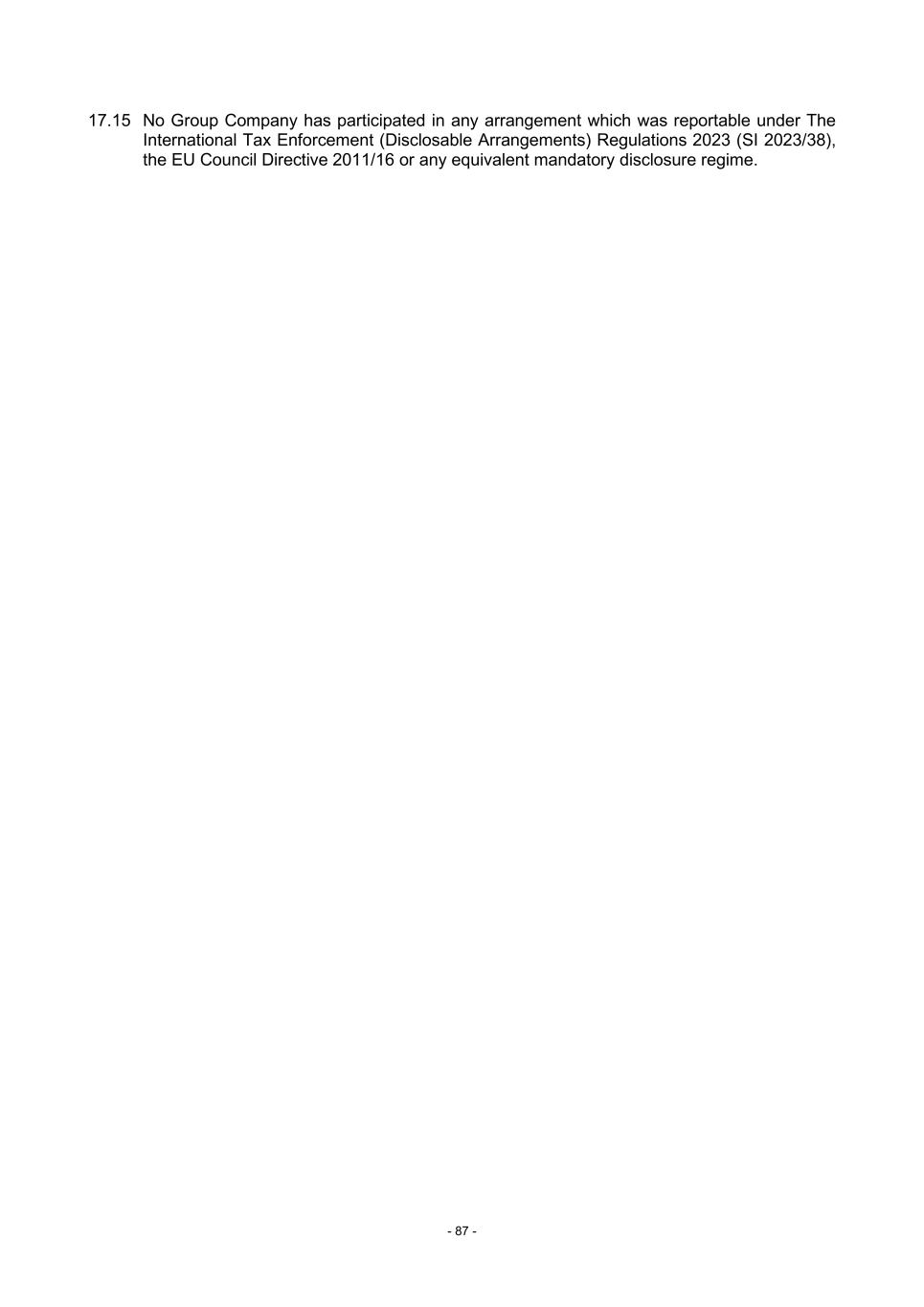 - 87 - 17.15 No Group Company has participated in any arrangement which was reportable under The International Tax Enforcement (Disclosable Arrangements) Regulations 2023 (SI 2023/38), the EU Council Directive 2011/16 or any equivalent mandatory disclosure regime.