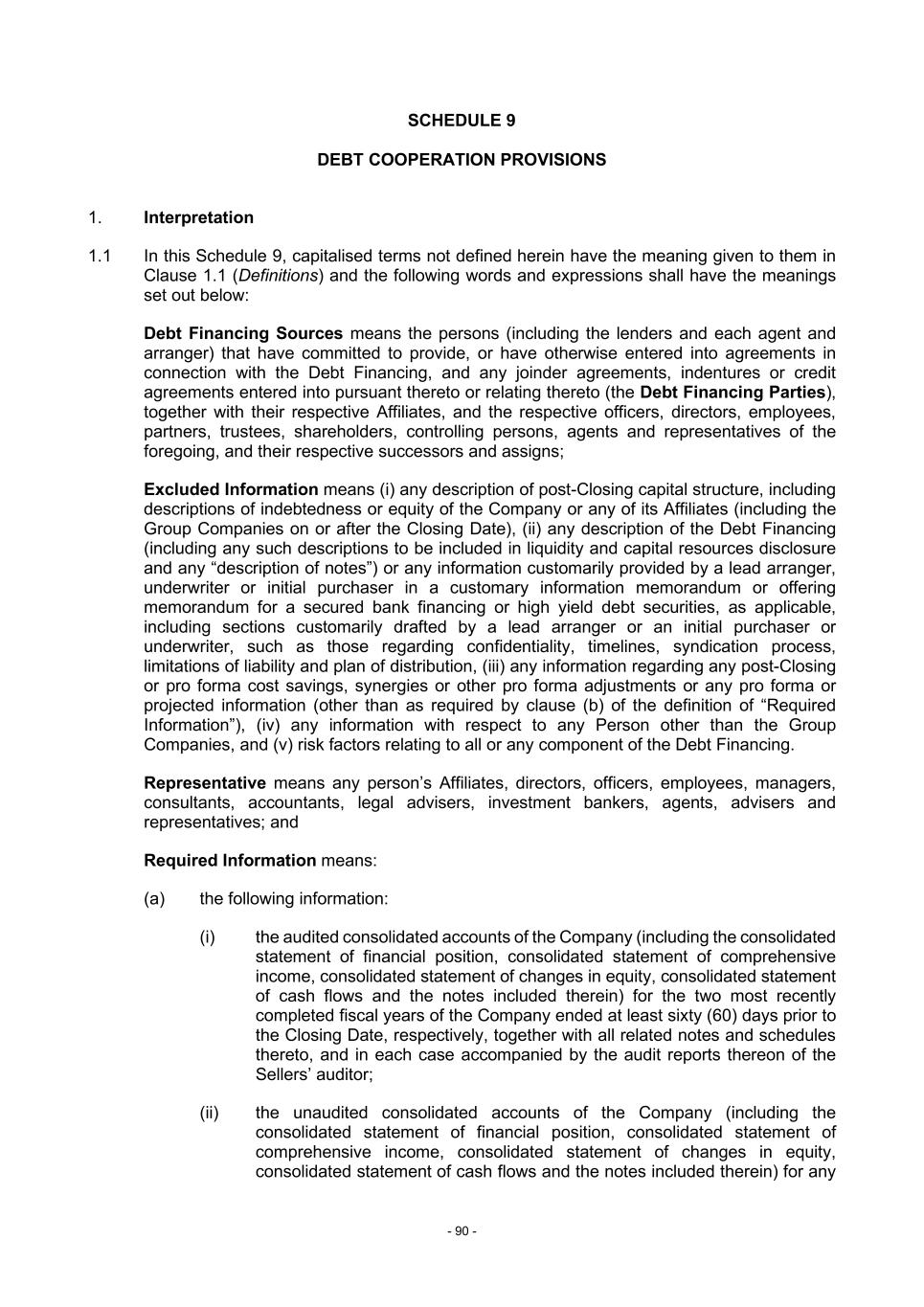 - 90 - SCHEDULE 9 DEBT COOPERATION PROVISIONS 1. Interpretation 1.1 In this Schedule 9, capitalised terms not defined herein have the meaning given to them in Clause 1.1 (Definitions) and the following words and expressions shall have the meanings set out below: Debt Financing Sources means the persons (including the lenders and each agent and arranger) that have committed to provide, or have otherwise entered into agreements in connection with the Debt Financing, and any joinder agreements, indentures or credit agreements entered into pursuant thereto or relating thereto (the Debt Financing Parties), together with their respective Affiliates, and the respective officers, directors, employees, partners, trustees, shareholders, controlling persons, agents and representatives of the foregoing, and their respective successors and assigns; Excluded Information means (i) any description of post-Closing capital structure, including descriptions of indebtedness or equity of the Company or any of its Affiliates (including the Group Companies on or after the Closing Date), (ii) any description of the Debt Financing (including any such descriptions to be included in liquidity and capital resources disclosure and any “description of notes”) or any information customarily provided by a lead arranger, underwriter or initial purchaser in a customary information memorandum or offering memorandum for a secured bank financing or high yield debt securities, as applicable, including sections customarily drafted by a lead arranger or an initial purchaser or underwriter, such as those regarding confidentiality, timelines, syndication process, limitations of liability and plan of distribution, (iii) any information regarding any post-Closing or pro forma cost savings, synergies or other pro forma adjustments or any pro forma or projected information (other than as required by clause (b) of the definition of “Required Information”), (iv) any information with respect to any Person other than the Group Companies, and (v) risk factors relating to all or any component of the Debt Financing. Representative means any person’s Affiliates, directors, officers, employees, managers, consultants, accountants, legal advisers, investment bankers, agents, advisers and representatives; and Required Information means: (a) the following information: (i) the audited consolidated accounts of the Company (including the consolidated statement of financial position, consolidated statement of comprehensive income, consolidated statement of changes in equity, consolidated statement of cash flows and the notes included therein) for the two most recently completed fiscal years of the Company ended at least sixty (60) days prior to the Closing Date, respectively, together with all related notes and schedules thereto, and in each case accompanied by the audit reports thereon of the Sellers’ auditor; (ii) the unaudited consolidated accounts of the Company (including the consolidated statement of financial position, consolidated statement of comprehensive income, consolidated statement of changes in equity, consolidated statement of cash flows and the notes included therein) for any