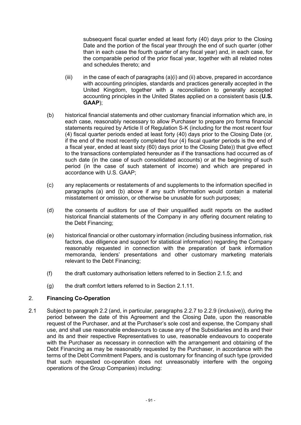 - 91 - subsequent fiscal quarter ended at least forty (40) days prior to the Closing Date and the portion of the fiscal year through the end of such quarter (other than in each case the fourth quarter of any fiscal year) and, in each case, for the comparable period of the prior fiscal year, together with all related notes and schedules thereto; and (iii) in the case of each of paragraphs (a)(i) and (ii) above, prepared in accordance with accounting principles, standards and practices generally accepted in the United Kingdom, together with a reconciliation to generally accepted accounting principles in the United States applied on a consistent basis (U.S. GAAP); (b) historical financial statements and other customary financial information which are, in each case, reasonably necessary to allow Purchaser to prepare pro forma financial statements required by Article II of Regulation S-K (including for the most recent four (4) fiscal quarter periods ended at least forty (40) days prior to the Closing Date (or, if the end of the most recently completed four (4) fiscal quarter periods is the end of a fiscal year, ended at least sixty (60) days prior to the Closing Date)) that give effect to the transactions contemplated hereunder as if the transactions had occurred as of such date (in the case of such consolidated accounts) or at the beginning of such period (in the case of such statement of income) and which are prepared in accordance with U.S. GAAP; (c) any replacements or restatements of and supplements to the information specified in paragraphs (a) and (b) above if any such information would contain a material misstatement or omission, or otherwise be unusable for such purposes; (d) the consents of auditors for use of their unqualified audit reports on the audited historical financial statements of the Company in any offering document relating to the Debt Financing; (e) historical financial or other customary information (including business information, risk factors, due diligence and support for statistical information) regarding the Company reasonably requested in connection with the preparation of bank information memoranda, lenders’ presentations and other customary marketing materials relevant to the Debt Financing; (f) the draft customary authorisation letters referred to in Section 2.1.5; and (g) the draft comfort letters referred to in Section 2.1.11. 2. Financing Co-Operation 2.1 Subject to paragraph 2.2 (and, in particular, paragraphs 2.2.7 to 2.2.9 (inclusive)), during the period between the date of this Agreement and the Closing Date, upon the reasonable request of the Purchaser, and at the Purchaser’s sole cost and expense, the Company shall use, and shall use reasonable endeavours to cause any of the Subsidiaries and its and their and its and their respective Representatives to use, reasonable endeavours to cooperate with the Purchaser as necessary in connection with the arrangement and obtaining of the Debt Financing as may be reasonably requested by the Purchaser, in accordance with the terms of the Debt Commitment Papers, and is customary for financing of such type (provided that such requested co-operation does not unreasonably interfere with the ongoing operations of the Group Companies) including: