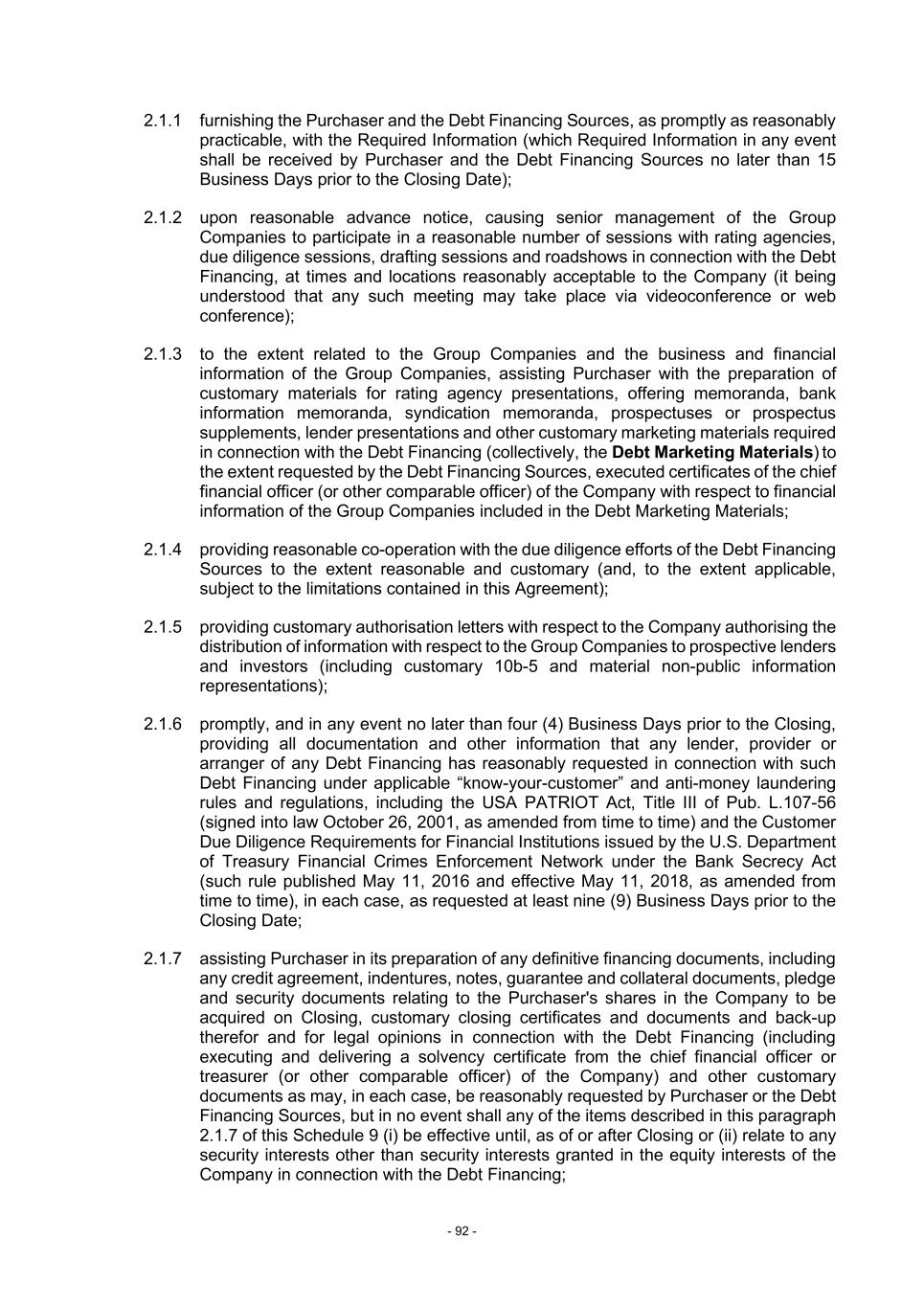 - 92 - 2.1.1 furnishing the Purchaser and the Debt Financing Sources, as promptly as reasonably practicable, with the Required Information (which Required Information in any event shall be received by Purchaser and the Debt Financing Sources no later than 15 Business Days prior to the Closing Date); 2.1.2 upon reasonable advance notice, causing senior management of the Group Companies to participate in a reasonable number of sessions with rating agencies, due diligence sessions, drafting sessions and roadshows in connection with the Debt Financing, at times and locations reasonably acceptable to the Company (it being understood that any such meeting may take place via videoconference or web conference); 2.1.3 to the extent related to the Group Companies and the business and financial information of the Group Companies, assisting Purchaser with the preparation of customary materials for rating agency presentations, offering memoranda, bank information memoranda, syndication memoranda, prospectuses or prospectus supplements, lender presentations and other customary marketing materials required in connection with the Debt Financing (collectively, the Debt Marketing Materials) to the extent requested by the Debt Financing Sources, executed certificates of the chief financial officer (or other comparable officer) of the Company with respect to financial information of the Group Companies included in the Debt Marketing Materials; 2.1.4 providing reasonable co-operation with the due diligence efforts of the Debt Financing Sources to the extent reasonable and customary (and, to the extent applicable, subject to the limitations contained in this Agreement); 2.1.5 providing customary authorisation letters with respect to the Company authorising the distribution of information with respect to the Group Companies to prospective lenders and investors (including customary 10b-5 and material non-public information representations); 2.1.6 promptly, and in any event no later than four (4) Business Days prior to the Closing, providing all documentation and other information that any lender, provider or arranger of any Debt Financing has reasonably requested in connection with such Debt Financing under applicable “know-your-customer” and anti-money laundering rules and regulations, including the USA PATRIOT Act, Title III of Pub. L.107-56 (signed into law October 26, 2001, as amended from time to time) and the Customer Due Diligence Requirements for Financial Institutions issued by the U.S. Department of Treasury Financial Crimes Enforcement Network under the Bank Secrecy Act (such rule published May 11, 2016 and effective May 11, 2018, as amended from time to time), in each case, as requested at least nine (9) Business Days prior to the Closing Date; 2.1.7 assisting Purchaser in its preparation of any definitive financing documents, including any credit agreement, indentures, notes, guarantee and collateral documents, pledge and security documents relating to the Purchaser's shares in the Company to be acquired on Closing, customary closing certificates and documents and back-up therefor and for legal opinions in connection with the Debt Financing (including executing and delivering a solvency certificate from the chief financial officer or treasurer (or other comparable officer) of the Company) and other customary documents as may, in each case, be reasonably requested by Purchaser or the Debt Financing Sources, but in no event shall any of the items described in this paragraph 2.1.7 of this Schedule 9 (i) be effective until, as of or after Closing or (ii) relate to any security interests other than security interests granted in the equity interests of the Company in connection with the Debt Financing;