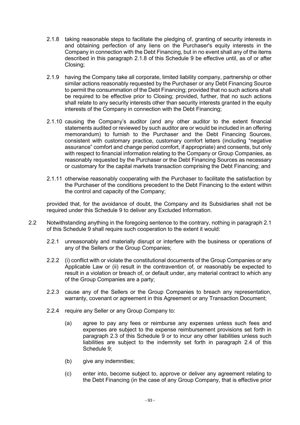 - 93 - 2.1.8 taking reasonable steps to facilitate the pledging of, granting of security interests in and obtaining perfection of any liens on the Purchaser's equity interests in the Company in connection with the Debt Financing, but in no event shall any of the items described in this paragraph 2.1.8 of this Schedule 9 be effective until, as of or after Closing; 2.1.9 having the Company take all corporate, limited liability company, partnership or other similar actions reasonably requested by the Purchaser or any Debt Financing Source to permit the consummation of the Debt Financing; provided that no such actions shall be required to be effective prior to Closing; provided, further, that no such actions shall relate to any security interests other than security interests granted in the equity interests of the Company in connection with the Debt Financing; 2.1.10 causing the Company’s auditor (and any other auditor to the extent financial statements audited or reviewed by such auditor are or would be included in an offering memorandum) to furnish to the Purchaser and the Debt Financing Sources, consistent with customary practice, customary comfort letters (including “negative assurance” comfort and change period comfort, if appropriate) and consents, but only with respect to financial information relating to the Company or Group Companies, as reasonably requested by the Purchaser or the Debt Financing Sources as necessary or customary for the capital markets transaction comprising the Debt Financing; and 2.1.11 otherwise reasonably cooperating with the Purchaser to facilitate the satisfaction by the Purchaser of the conditions precedent to the Debt Financing to the extent within the control and capacity of the Company; provided that, for the avoidance of doubt, the Company and its Subsidiaries shall not be required under this Schedule 9 to deliver any Excluded Information. 2.2 Notwithstanding anything in the foregoing sentence to the contrary, nothing in paragraph 2.1 of this Schedule 9 shall require such cooperation to the extent it would: 2.2.1 unreasonably and materially disrupt or interfere with the business or operations of any of the Sellers or the Group Companies; 2.2.2 (i) conflict with or violate the constitutional documents of the Group Companies or any Applicable Law or (ii) result in the contravention of, or reasonably be expected to result in a violation or breach of, or default under, any material contract to which any of the Group Companies are a party; 2.2.3 cause any of the Sellers or the Group Companies to breach any representation, warranty, covenant or agreement in this Agreement or any Transaction Document; 2.2.4 require any Seller or any Group Company to: (a) agree to pay any fees or reimburse any expenses unless such fees and expenses are subject to the expense reimbursement provisions set forth in paragraph 2.3 of this Schedule 9 or to incur any other liabilities unless such liabilities are subject to the indemnity set forth in paragraph 2.4 of this Schedule 9; (b) give any indemnities; (c) enter into, become subject to, approve or deliver any agreement relating to the Debt Financing (in the case of any Group Company, that is effective prior