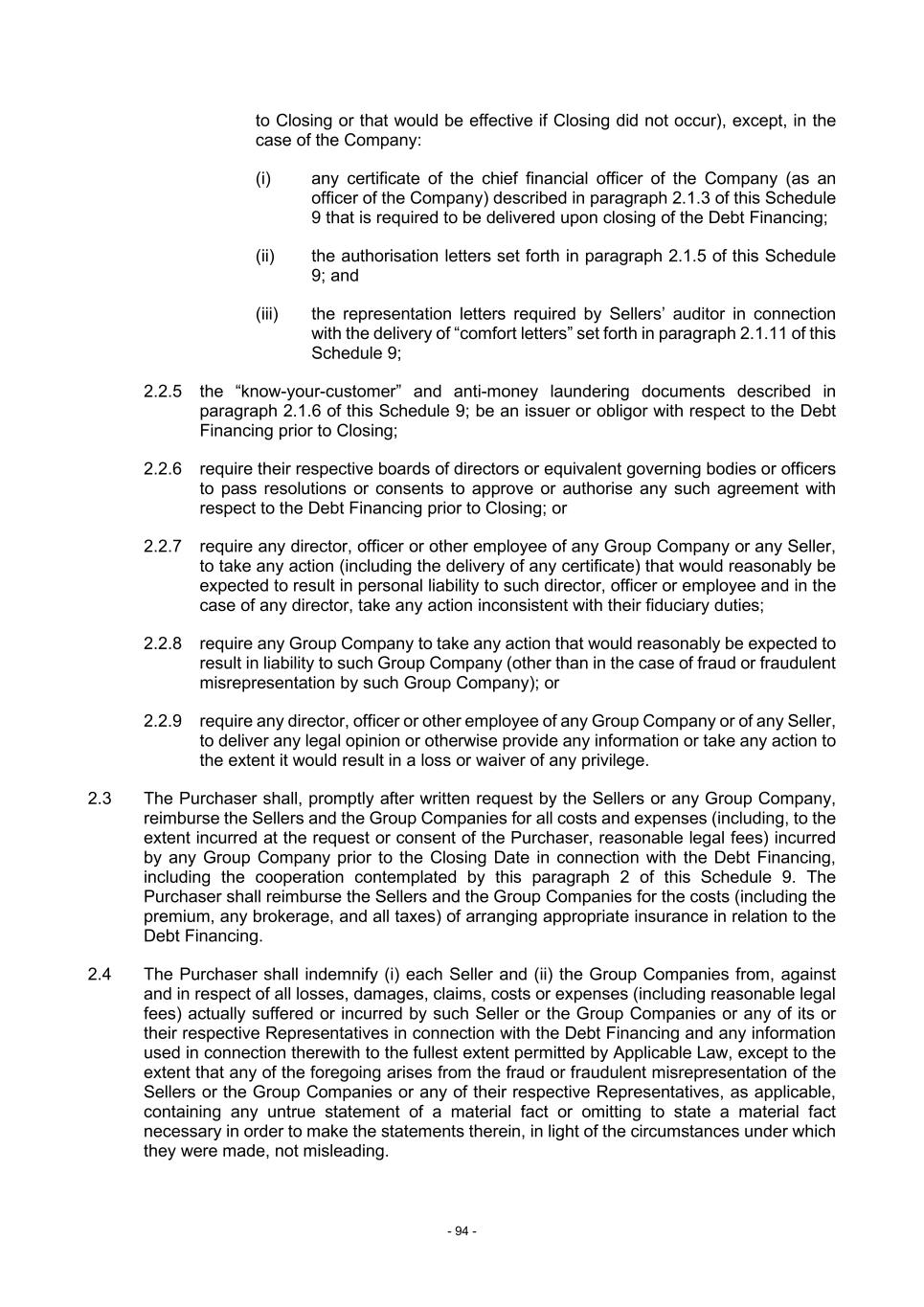 - 94 - to Closing or that would be effective if Closing did not occur), except, in the case of the Company: (i) any certificate of the chief financial officer of the Company (as an officer of the Company) described in paragraph 2.1.3 of this Schedule 9 that is required to be delivered upon closing of the Debt Financing; (ii) the authorisation letters set forth in paragraph 2.1.5 of this Schedule 9; and (iii) the representation letters required by Sellers’ auditor in connection with the delivery of “comfort letters” set forth in paragraph 2.1.11 of this Schedule 9; 2.2.5 the “know-your-customer” and anti-money laundering documents described in paragraph 2.1.6 of this Schedule 9; be an issuer or obligor with respect to the Debt Financing prior to Closing; 2.2.6 require their respective boards of directors or equivalent governing bodies or officers to pass resolutions or consents to approve or authorise any such agreement with respect to the Debt Financing prior to Closing; or 2.2.7 require any director, officer or other employee of any Group Company or any Seller, to take any action (including the delivery of any certificate) that would reasonably be expected to result in personal liability to such director, officer or employee and in the case of any director, take any action inconsistent with their fiduciary duties; 2.2.8 require any Group Company to take any action that would reasonably be expected to result in liability to such Group Company (other than in the case of fraud or fraudulent misrepresentation by such Group Company); or 2.2.9 require any director, officer or other employee of any Group Company or of any Seller, to deliver any legal opinion or otherwise provide any information or take any action to the extent it would result in a loss or waiver of any privilege. 2.3 The Purchaser shall, promptly after written request by the Sellers or any Group Company, reimburse the Sellers and the Group Companies for all costs and expenses (including, to the extent incurred at the request or consent of the Purchaser, reasonable legal fees) incurred by any Group Company prior to the Closing Date in connection with the Debt Financing, including the cooperation contemplated by this paragraph 2 of this Schedule 9. The Purchaser shall reimburse the Sellers and the Group Companies for the costs (including the premium, any brokerage, and all taxes) of arranging appropriate insurance in relation to the Debt Financing. 2.4 The Purchaser shall indemnify (i) each Seller and (ii) the Group Companies from, against and in respect of all losses, damages, claims, costs or expenses (including reasonable legal fees) actually suffered or incurred by such Seller or the Group Companies or any of its or their respective Representatives in connection with the Debt Financing and any information used in connection therewith to the fullest extent permitted by Applicable Law, except to the extent that any of the foregoing arises from the fraud or fraudulent misrepresentation of the Sellers or the Group Companies or any of their respective Representatives, as applicable, containing any untrue statement of a material fact or omitting to state a material fact necessary in order to make the statements therein, in light of the circumstances under which they were made, not misleading.