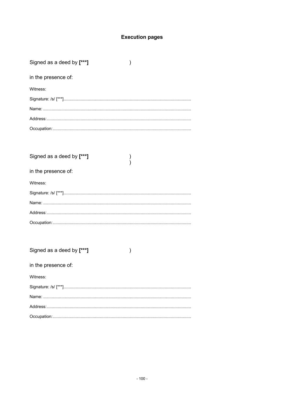 - 100 - Execution pages Signed as a deed by [***] in the presence of: ) Witness: Signature: /s/ [***] .......................................................................................................... Name: ........................................................................................................................... Address: ........................................................................................................................ Occupation: ................................................................................................................... Signed as a deed by [***] in the presence of: ) ) Witness: Signature: /s/ [***] .......................................................................................................... Name: ........................................................................................................................... Address: ........................................................................................................................ Occupation: ................................................................................................................... Signed as a deed by [***] in the presence of: ) Witness: Signature: /s/ [***] .......................................................................................................... Name: ........................................................................................................................... Address: ........................................................................................................................ Occupation: ...................................................................................................................