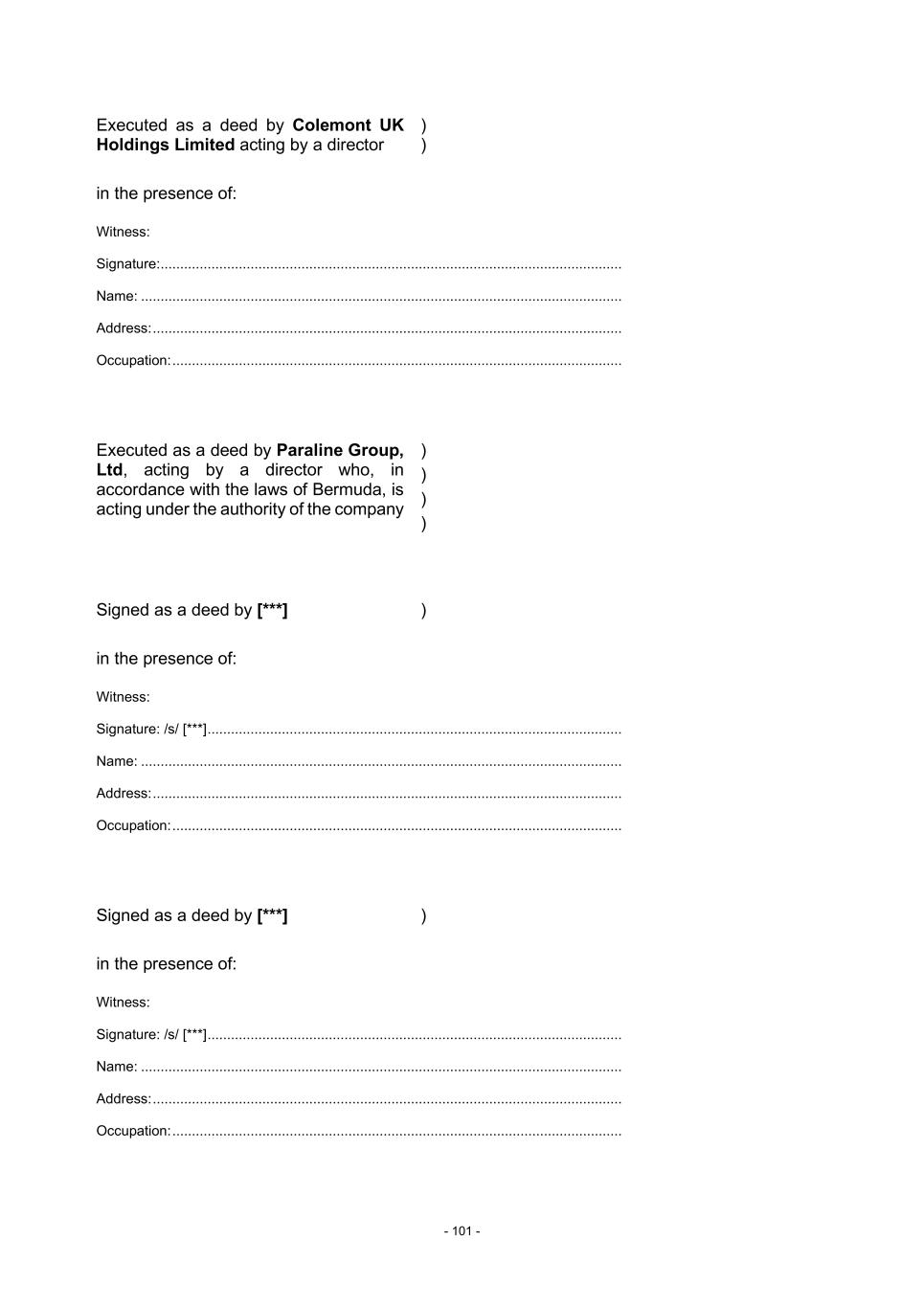 - 101 - Executed as a deed by Colemont UK Holdings Limited acting by a director in the presence of: ) ) Witness: Signature: ...................................................................................................................... Name: ........................................................................................................................... Address: ........................................................................................................................ Occupation: ................................................................................................................... Executed as a deed by Paraline Group, Ltd, acting by a director who, in accordance with the laws of Bermuda, is acting under the authority of the company ) ) ) ) Signed as a deed by [***] in the presence of: ) Witness: Signature: /s/ [***] .......................................................................................................... Name: ........................................................................................................................... Address: ........................................................................................................................ Occupation: ................................................................................................................... Signed as a deed by [***] in the presence of: ) Witness: Signature: /s/ [***] .......................................................................................................... Name: ........................................................................................................................... Address: ........................................................................................................................ Occupation: ...................................................................................................................