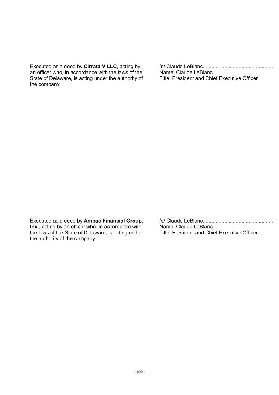 - 102 - Executed as a deed by Cirrata V LLC, acting by an officer who, in accordance with the laws of the State of Delaware, is acting under the authority of the company /s/ Claude LeBlanc................................................. Name: Claude LeBlanc Title: President and Chief Executive Officer Executed as a deed by Ambac Financial Group, Inc., acting by an officer who, in accordance with the laws of the State of Delaware, is acting under the authority of the company /s/ Claude LeBlanc................................................. Name: Claude LeBlanc Title: President and Chief Executive Officer