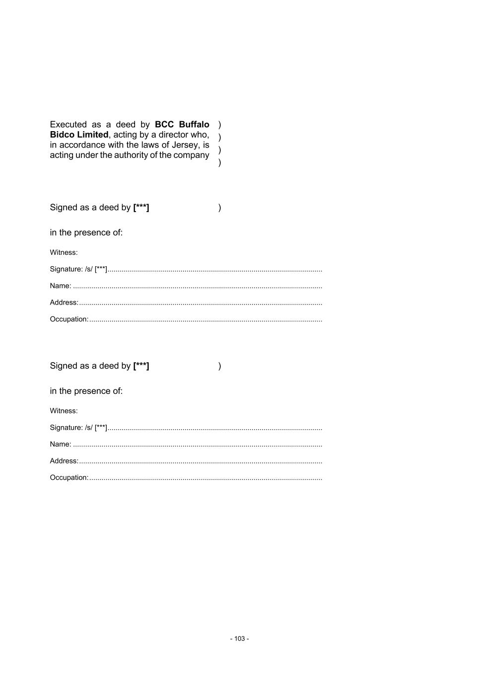 - 103 - Executed as a deed by BCC Buffalo Bidco Limited, acting by a director who, in accordance with the laws of Jersey, is acting under the authority of the company ) ) ) ) Signed as a deed by [***] in the presence of: ) Witness: Signature: /s/ [***] .......................................................................................................... Name: ........................................................................................................................... Address: ........................................................................................................................ Occupation: ................................................................................................................... Signed as a deed by [***] in the presence of: ) Witness: Signature: /s/ [***] .......................................................................................................... Name: ........................................................................................................................... Address: ........................................................................................................................ Occupation: ...................................................................................................................