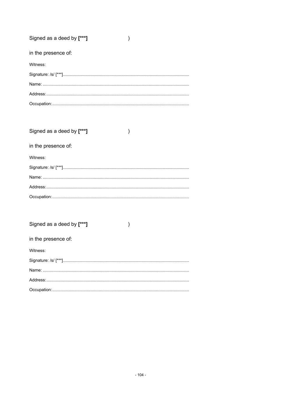- 104 - Signed as a deed by [***] in the presence of: ) Witness: Signature: /s/ [***] .......................................................................................................... Name: ........................................................................................................................... Address: ........................................................................................................................ Occupation: ................................................................................................................... Signed as a deed by [***] in the presence of: ) Witness: Signature: /s/ [***] .......................................................................................................... Name: ........................................................................................................................... Address: ........................................................................................................................ Occupation: ................................................................................................................... Signed as a deed by [***] in the presence of: ) Witness: Signature: /s/ [***] .......................................................................................................... Name: ........................................................................................................................... Address: ........................................................................................................................ Occupation: ...................................................................................................................