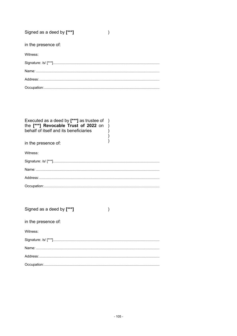 - 105 - Signed as a deed by [***] in the presence of: ) Witness: Signature: /s/ [***] .......................................................................................................... Name: ........................................................................................................................... Address: ........................................................................................................................ Occupation: ................................................................................................................... Executed as a deed by [***] as trustee of the [***] Revocable Trust of 2022 on behalf of itself and its beneficiaries in the presence of: ) ) ) ) ) Witness: Signature: /s/ [***]. ......................................................................................................... Name: ........................................................................................................................... Address: ........................................................................................................................ Occupation: ................................................................................................................... Signed as a deed by [***] in the presence of: ) Witness: Signature: /s/ [***] .......................................................................................................... Name: ........................................................................................................................... Address: ........................................................................................................................ Occupation: ...................................................................................................................
