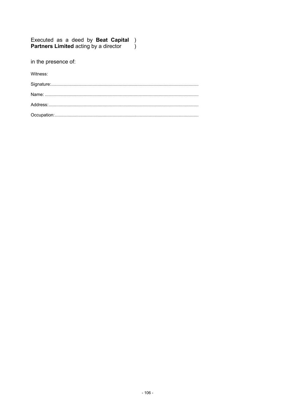 - 106 - Executed as a deed by Beat Capital Partners Limited acting by a director in the presence of: ) ) Witness: Signature: ...................................................................................................................... Name: ........................................................................................................................... Address: ........................................................................................................................ Occupation: ...................................................................................................................