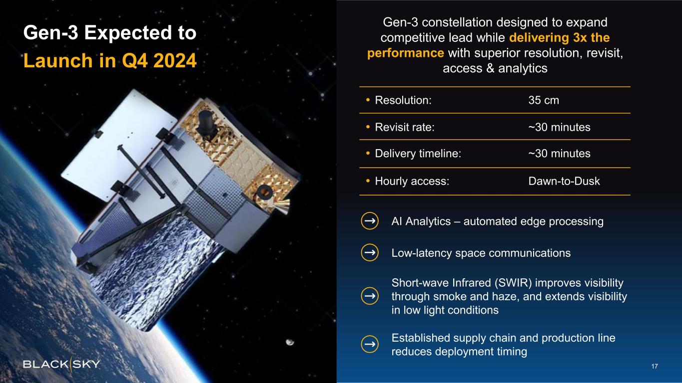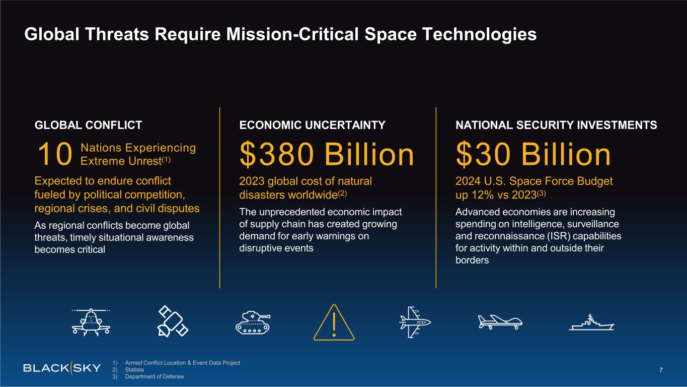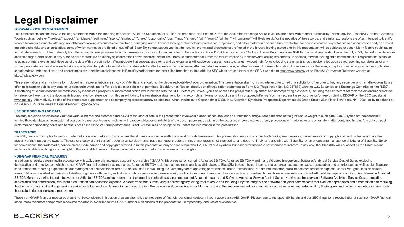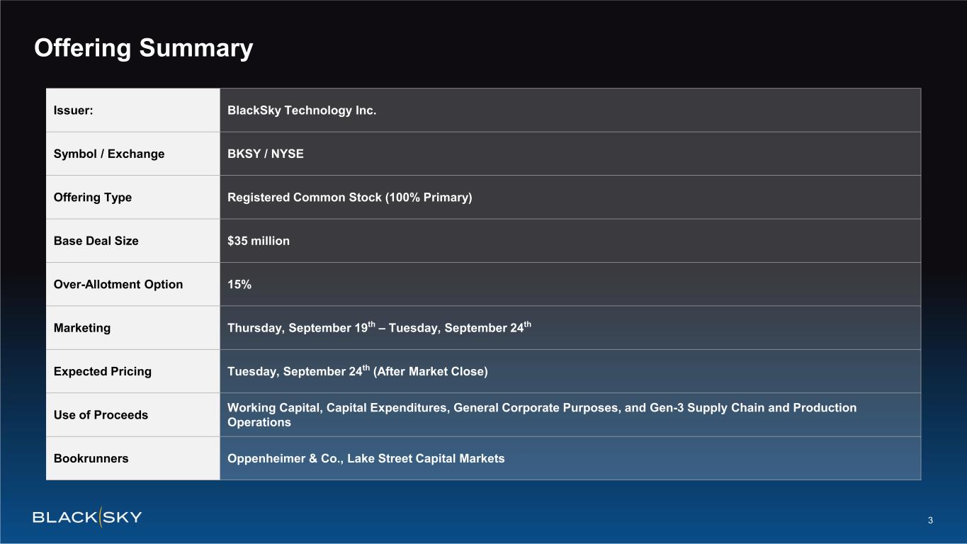 Legal Disclaimer 2 FORWARD-LOOKING STATEMENTS This presentation contains forward-looking statements within the meaning of Section 27A of the Securities Act of 1933, as amended, and Section 21E of the Securities Exchange Act of 1934, as amended, with respect to BlackSky Technology Inc “BlackSky” or the “Company”). Words such as “believe,” “project,” “expect,” “anticipate,” “estimate,” “intend,” “strategy,” “future,” “opportunity,” “plan,” “may,” “should,” “will,” “would,” “will be,” “will continue,” “will likely result,” or the negative of these words, and similar expressions are often intended to identify forward-looking statements, although not all forward-looking statements contain these identifying words. Forward-looking statements are predictions, projections, and other statements about future events that are based on current expectations and assumptions and, as a result, are subject to risks and uncertainties, some of which cannot be predicted or quantified. BlackSky cannot assure you that the results, events, and circumstances reflected in the forward-looking statements in this presentation will be achieved or occur. Many factors could cause actual future events to differ materially from the forward-looking statements in this presentation, including those described in the section captioned “Risk Factors” in Item 1A of our Annual Report on Form 10-K for the fiscal year ended December 31, 2023, filed with the Securities and Exchange Commission. If any of these risks materialize or underlying assumptions prove incorrect, actual results could differ materially from the results implied by these forward-looking statements. In addition, forward-looking statements reflect our expectations, plans, or forecasts of future events and views as of the date of this presentation. We anticipate that subsequent events and developments will cause our assessments to change. Accordingly, forward-looking statements should not be relied upon as representing our views as of any subsequent date, and we do not undertake any obligation to update forward-looking statements to reflect events or circumstances after the date they were made, whether as a result of new information, future events or otherwise, except as may be required under applicable securities laws. Additional risks and uncertainties are identified and discussed in BlackSky’s disclosure materials filed from time to time with the SEC which are available at the SEC’s website at http://www.sec.gov or on BlackSky’s Investor Relations website at https://ir.blacksky.com. This presentation and any information included in this presentation are strictly confidential and should not be discussed outside of your organization. This presentation shall not constitute an offer to sell or a solicitation of an offer to buy any securities and shall not constitute an offer, solicitation or sale in any state or jurisdiction in which such offer, solicitation or sale is not permitted. BlackSky has filed an effective shelf registration statement on Form S-3 (Registration No. 333-267889) with the U.S. Securities and Exchange Commission (the "SEC"). Any offering of securities would be made only by means of a prospectus supplement, which would be filed with the SEC. Before you invest, you should read the prospectus supplement and accompanying prospectus, including the risk factors set forth therein and incorporated by reference therein, and the documents incorporated by reference in or filed as exhibits to the registration statement, for more complete information about us and this proposed offering. You may access these documents for free by visiting EDGAR on the SEC website at www.sec.gov. Alternatively, copies of the prospectus supplement and accompanying prospectus may be obtained, when available, to Oppenheimer & Co. Inc., Attention: Syndicate Prospectus Department, 85 Broad Street, 26th Floor, New York, NY 10004, or by telephone at (212) 667-8055, or by email at EquityProspectus@opco.com. USE OF MODELING AND DATA The data contained herein is derived from various internal and external sources. All of the market data in the presentation involves a number of assumptions and limitations, and you are cautioned not to give undue weight to such data. BlackSky has not independently verified the data obtained from external sources. No representation is made as to the reasonableness or reliability of the assumptions made within or the accuracy or completeness of any projections or modeling or any other information contained herein. Any data on past performance or modeling contained herein is not an indication of future performance. BlackSky assumes no obligation to update the information in this presentation. TRADEMARKS BlackSky owns or has rights to various trademarks, service marks and trade names that it uses in connection with the operation of its businesses. This presentation may also contain trademarks, service marks, trade names and copyrights of third parties, which are the property of their respective owners. The use or display of third parties’ trademarks, service marks, trade names or products in this presentation is not intended to, and does not imply, a relationship with BlackSky, or an endorsement or sponsorship by or of BlackSky. Solely for convenience, the trademarks, service marks, trade names and copyrights referred to in this presentation may appear without the TM, SM, ® or © symbols, but such references are not intended to indicate, in any way, that BlackSky will not assert, to the fullest extent under applicable law, its rights or the right of the applicable licensor to these trademarks, service marks, trade names and copyrights. NON-GAAP FINANCIAL MEASURES In addition to results determined in accordance with U.S. generally accepted accounting principles (“GAAP”), this presentation contains Adjusted EBITDA, Adjusted EBITDA Margin, and Adjusted Imagery and Software