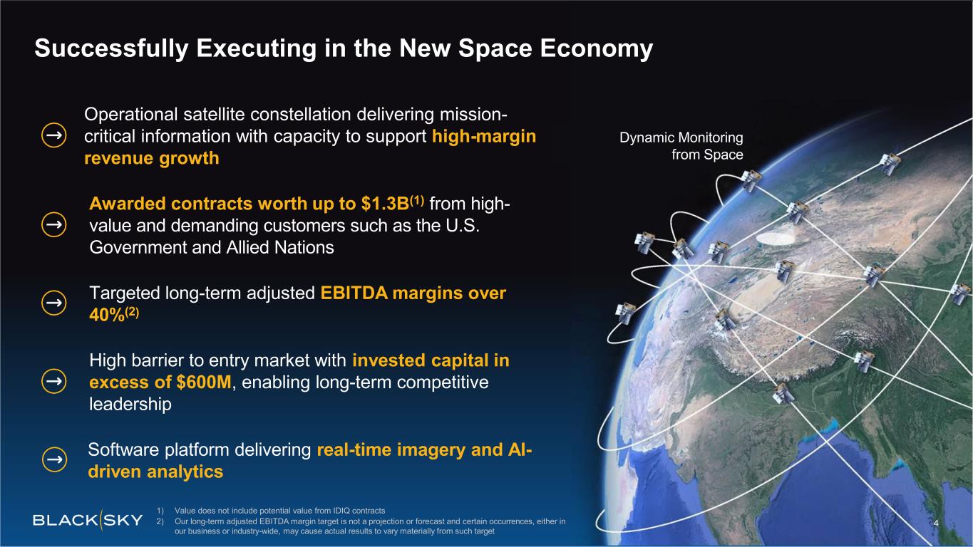 Offering Summary 3 Issuer: BlackSky Technology Inc. Symbol / Exchange BKSY / NYSE Offering Type Registered Common Stock (100% Primary) Base Deal Size $35 million Over-Allotment Option 15% Marketing Thursday, September 19th – Tuesday, September 24th Expected Pricing Tuesday, September 24th (After Market Close) Use of Proceeds Working Capital, Capital Expenditures, General Corporate Purposes, and Gen-3 Supply Chain and Production Operations Bookrunners Oppenheimer & Co., Lake Street Capital Markets