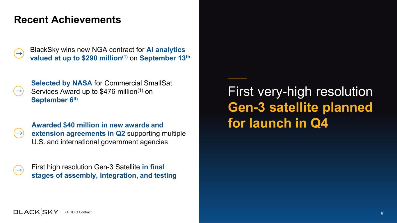 Recent Achievements 6 Selected by NASA for Commercial SmallSat Services Award up to $476 million(1) on September 6th Awarded $40 million in new awards and extension agreements in Q2 supporting multiple U.S. and international government agencies First high resolution Gen-3 Satellite in final stages of assembly, integration, and testing (1) IDIQ Contract BlackSky wins new NGA contract for AI analytics valued at up to $290 million(1) on September 13th First very-high resolution Gen-3 satellite planned for launch in Q4