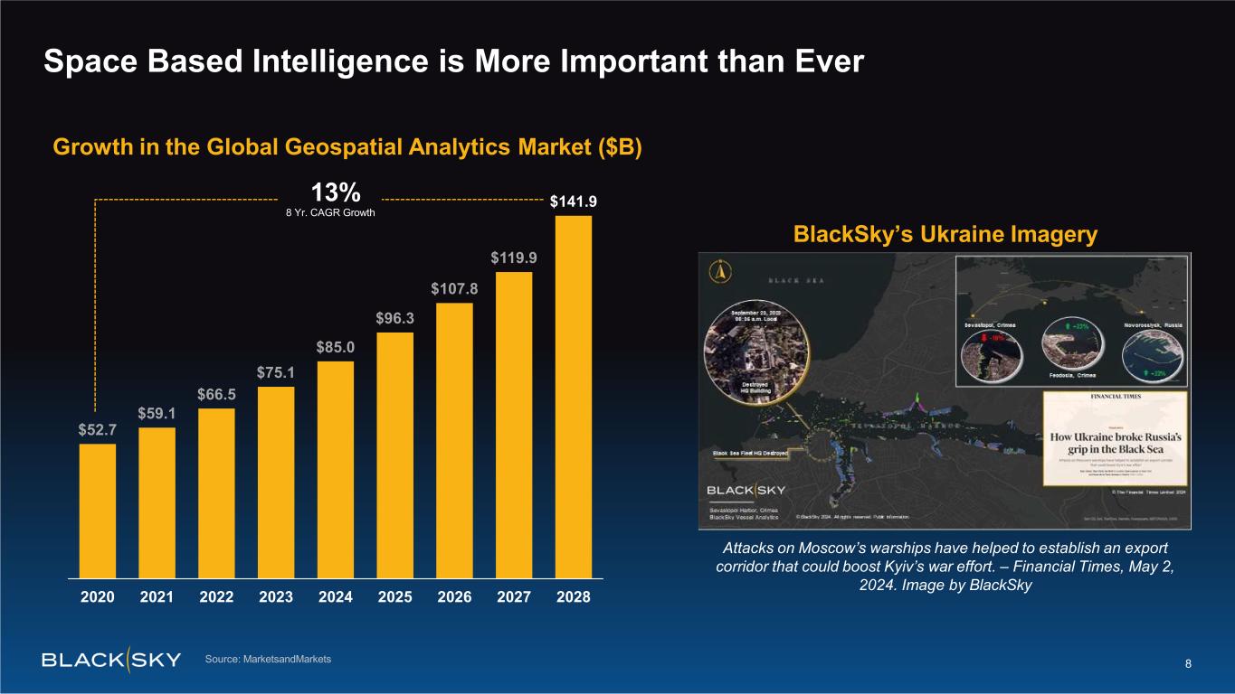 Growth in the Global Geospatial Analytics Market ($B) Source: MarketsandMarkets Space Based Intelligence is More Important than Ever 8 Attacks on Moscow’s warships have helped to establish an export corridor that could boost Kyiv’s war effort. – Financial Times, May 2, 2024. Image by BlackSky BlackSky’s Ukraine Imagery 13% 8 Yr. CAGR Growth $52.7 $59.1 $66.5 $75.1 $85.0 $96.3 $107.8 $119.9 $141.9 2020 2021 2022 2023 2024 2025 2026 2027 2028