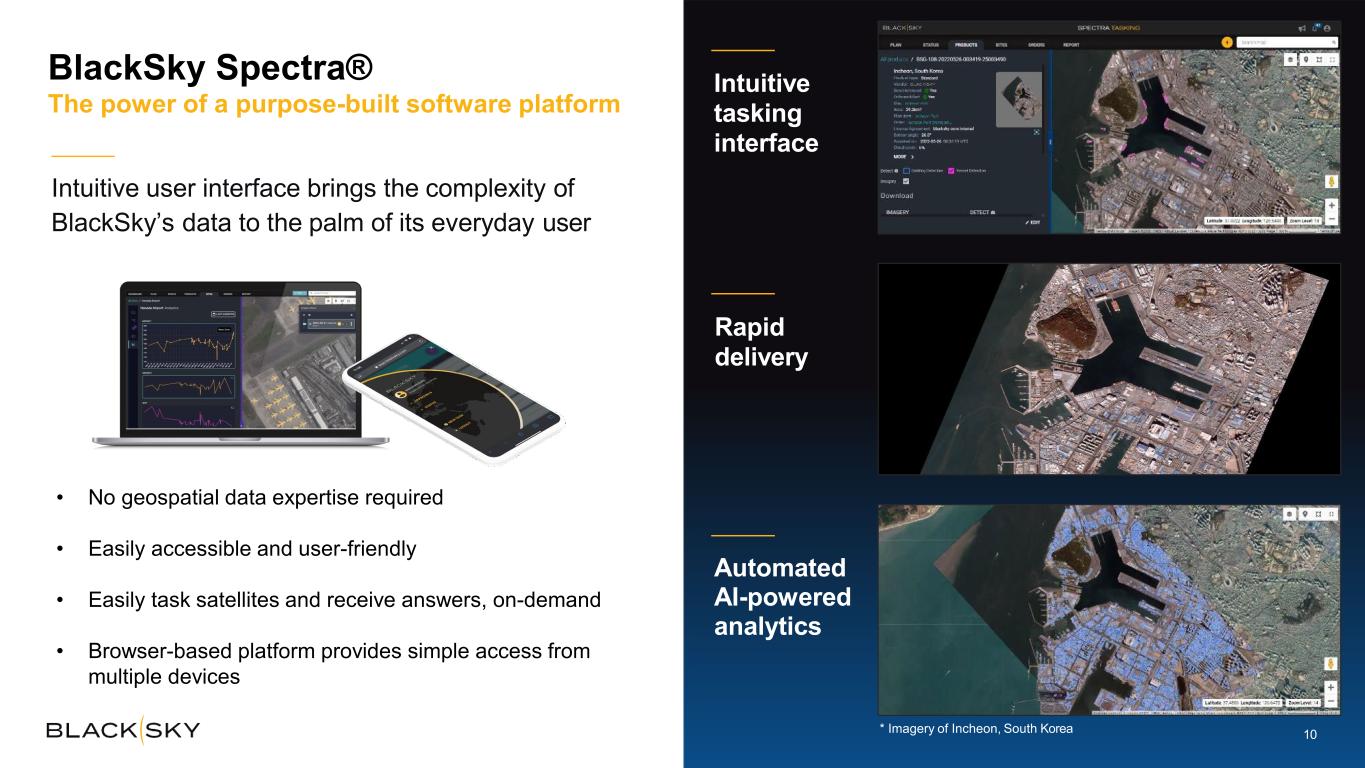 Key Capabilities Legacy Imaging(1) Legacy Mapping(2) Constellation Purpose Dynamic Monitoring 13 SATS VHR Imaging 6 SATS Static Global Mapping 100+ SATS Reliable Dynamic Hourly Monitoring Real-Time AI-Enabled Analytics Real-Time Autonomous Delivery Multi-Source Tasking and AI Analytics Multi-Spectral AI Software Platform Static Daily Imaging (Same Time) BlackSky: Space Based Intelligence Designed to Meet Today’s Mission-Critical Decisions 9 BlackSky’s Real-Time Architecture Provides High Frequency Imaging with Low Latency Delivery and Integrated AI Analytics Dynamic Hourly Monitoring Mapping: Daily at Same Time 1) Data relates to one legacy imaging competitor and is based on publicly available information 2) Data relates to one legacy mapping competitor and is based on publicly available information