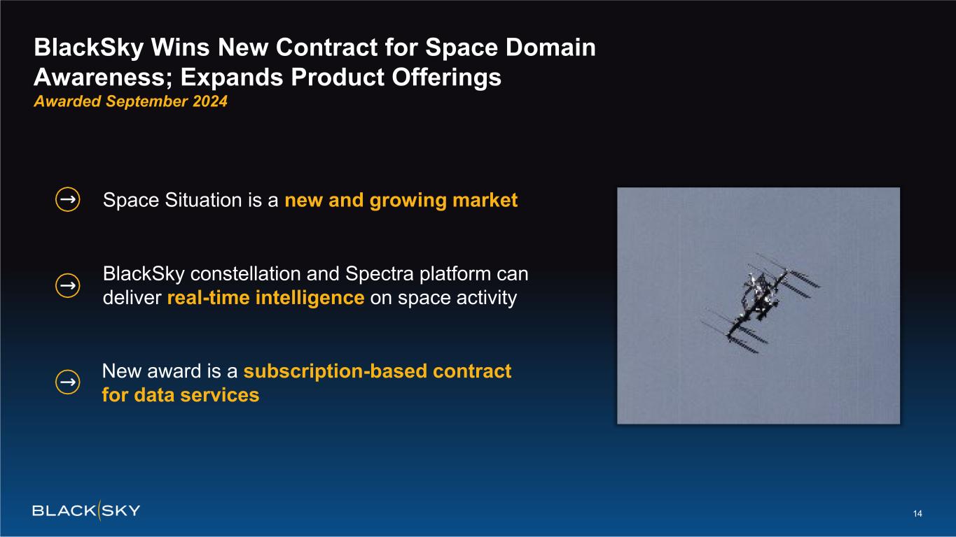 BlackSky Wins New Contract for Space Domain Awareness; Expands Product Offerings Awarded September 2024 14 Space Situation is a new and growing market BlackSky constellation and Spectra platform can deliver real-time intelligence on space activity New award is a subscription-based contract for data services