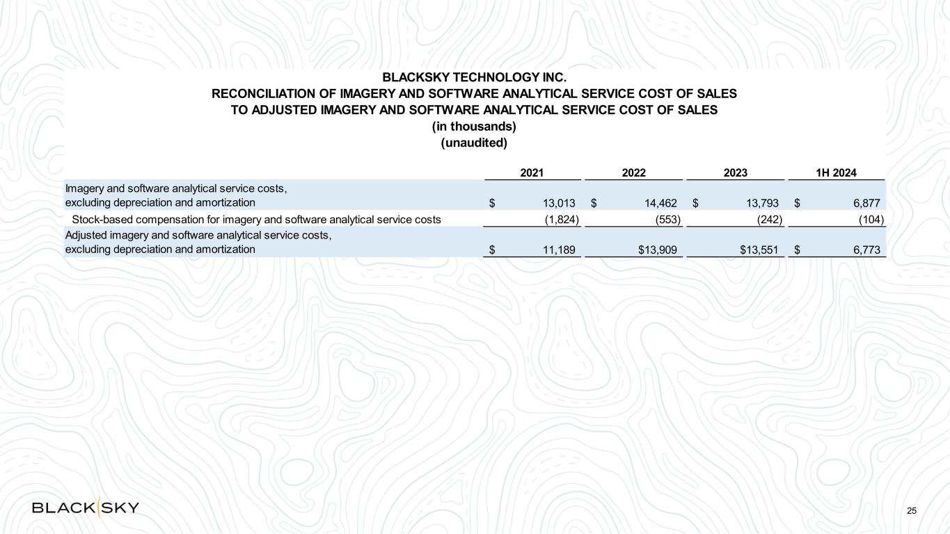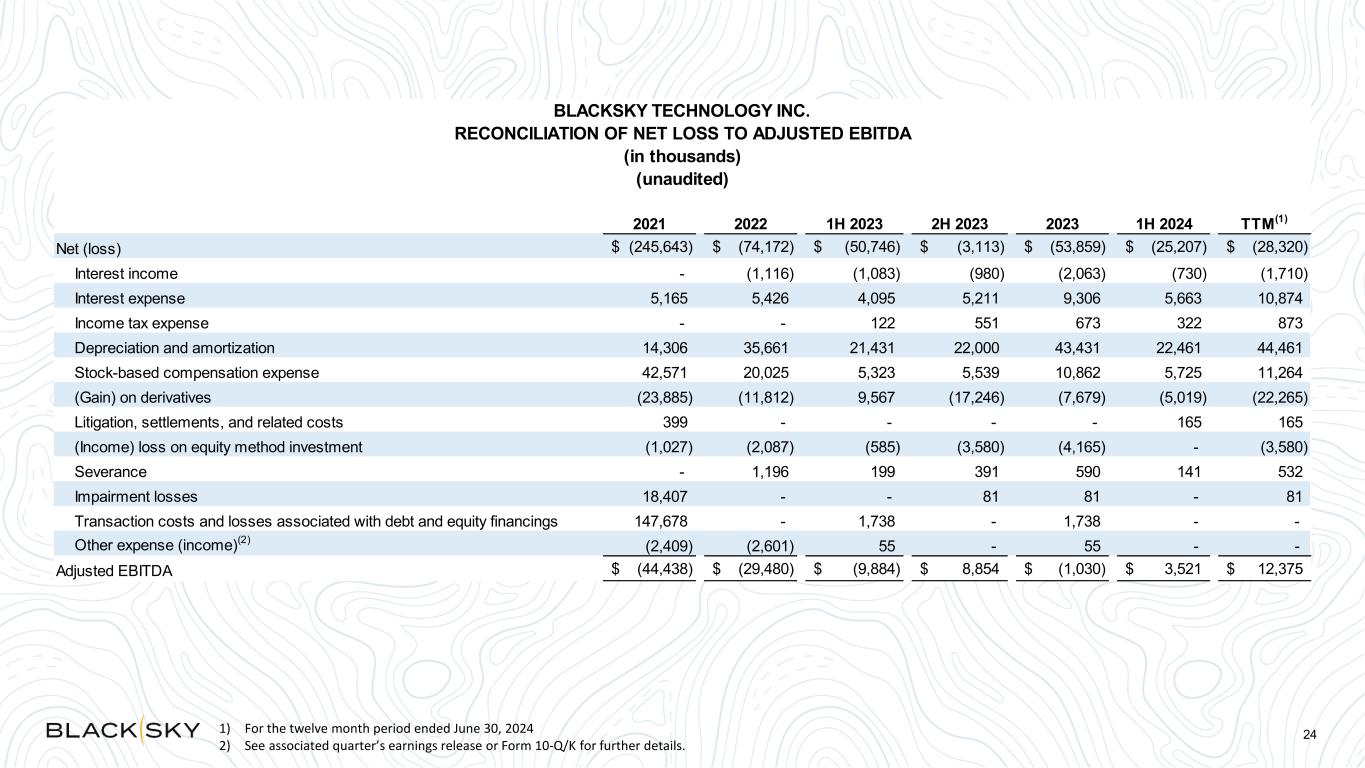 241) For the twelve month period ended June 30, 2024 2) See associated quarter’s earnings release or Form 10-Q/K for further details. BLACKSKY TECHNOLOGY INC. RECONCILIATION OF NET LOSS TO ADJUSTED EBITDA (in thousands) (unaudited) 2021 2022 1H 2023 2H 2023 2023 1H 2024 TTM(1) Net (loss) (245,643)$ (74,172)$ (50,746)$ (3,113)$ (53,859)$ (25,207)$ (28,320)$ Interest income - (1,116) (1,083) (980) (2,063) (730) (1,710) Interest expense 5,165 5,426 4,095 5,211 9,306 5,663 10,874 Income tax expense - - 122 551 673 322 873 Depreciation and amortization 14,306 35,661 21,431 22,000 43,431 22,461 44,461 Stock-based compensation expense 42,571 20,025 5,323 5,539 10,862 5,725 11,264 (Gain) on derivatives (23,885) (11,812) 9,567 (17,246) (7,679) (5,019) (22,265) Litigation, settlements, and related costs 399 - - - - 165 165 (Income) loss on equity method investment (1,027) (2,087) (585) (3,580) (4,165) - (3,580) Severance - 1,196 199 391 590 141 532 Impairment losses 18,407 - - 81 81 - 81 Transaction costs and losses associated with debt and equity financings 147,678 - 1,738 - 1,738 - - Other expense (income)(2) (2,409) (2,601) 55 - 55 - - Adjusted EBITDA (44,438)$ (29,480)$ (9,884)$ 8,854$ (1,030)$ 3,521$ 12,375$