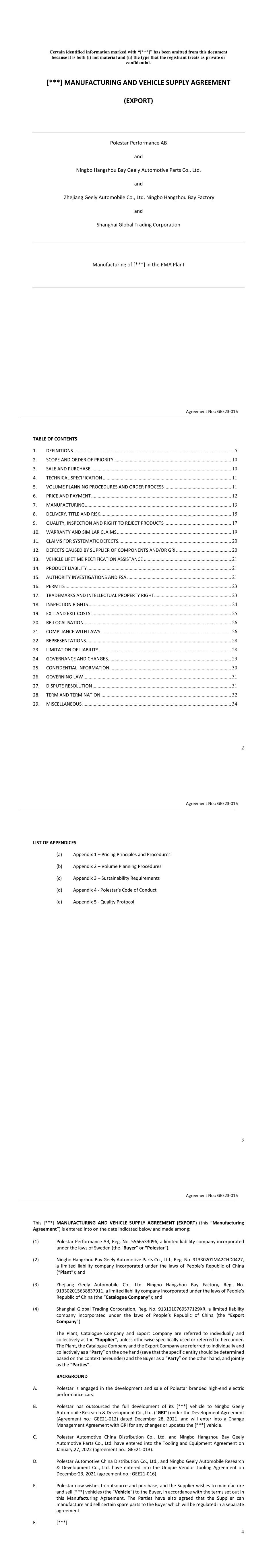Certain identified information marked with “[***]” has been omitted from this document because it is both (i) not material and (ii) the type that the registrant treats as private or confidential. [***] MANUFACTURING AND VEHICLE SUPPLY AGREEMENT (EXPORT) Polestar Performance AB and Ningbo Hangzhou Bay Geely Automotive Parts Co., Ltd. and Zhejiang Geely Automobile Co., Ltd. Ningbo Hangzhou Bay Factory and Shanghai Global Trading Corporation Manufacturing of [***] in the PMA Plant Agreement No.: GEE23-016 2 TABLE OF CONTENTS 1. DEFINITIONS ............................................................................................................................. 5 2. SCOPE AND ORDER OF PRIORITY ........................................................................................... 10 3. SALE AND PURCHASE ............................................................................................................. 10 4. TECHNICAL SPECIFICATION .................................................................................................... 11 5. VOLUME PLANNING PROCEDURES AND ORDER PROCESS .................................................... 11 6. PRICE AND PAYMENT ............................................................................................................. 12 7. MANUFACTURING .................................................................................................................. 13 8. DELIVERY, TITLE AND RISK ...................................................................................................... 15 9. QUALITY, INSPECTION AND RIGHT TO REJECT PRODUCTS .................................................... 17 10. WARRANTY AND SIMILAR CLAIMS ......................................................................................... 19 11. CLAIMS FOR SYSTEMATIC DEFECTS........................................................................................ 20 12. DEFECTS CAUSED BY SUPPLIER OF COMPONENTS AND/OR GRI ........................................... 20 13. VEHICLE LIFETIME RECTIFICATION ASSISTANCE .................................................................... 21 14. PRODUCT LIABILITY ................................................................................................................ 21 15. AUTHORITY INVESTIGATIONS AND FSA ................................................................................. 21 16. PERMITS ................................................................................................................................. 23 17. TRADEMARKS AND INTELLECTUAL PROPERTY RIGHT ............................................................ 23 18. INSPECTION RIGHTS ............................................................................................................... 24 19. EXIT AND EXIT COSTS ............................................................................................................. 25 20. RE-LOCALISATION................................................................................................................... 26 21. COMPLIANCE WITH LAWS ...................................................................................................... 26 22. REPRESENTATIONS ................................................................................................................. 28 23. LIMITATION OF LIABILITY ....................................................................................................... 28 24. GOVERNANCE AND CHANGES ................................................................................................ 29 25. CONFIDENTIAL INFORMATION............................................................................................... 30 26. GOVERNING LAW ................................................................................................................... 31 27. DISPUTE RESOLUTION ............................................................................................................ 31 28. TERM AND TERMINATION ..................................................................................................... 32 29. MISCELLANEOUS .................................................................................................................... 34 Agreement No.: GEE23-016 3 LIST OF APPENDICES (a) Appendix 1 – Pricing Principles and Procedures (b) Appendix 2 – Volume Planning Procedures (c) Appendix 3 – Sustainability Requirements (d) Appendix 4 - Polestar’s Code of Conduct (e) Appendix 5 - Quality Protocol Agreement No.: GEE23-016 4 This [***] MANUFACTURING AND VEHICLE SUPPLY AGREEMENT (EXPORT) (this “Manufacturing Agreement”) is entered into on the date indicated below and made among: (1) Polestar Performance AB, Reg. No. 5566533096, a limited liability company incorporated under the laws of Sweden (the “Buyer” or “Polestar”). (2) Ningbo Hangzhou Bay Geely Automotive Parts Co., Ltd., Reg. No. 91330201MA2CHD0427, a limited liability company incorporated under the laws of People's Republic of China (“Plant”); and (3) Zhejiang Geely Automobile Co., Ltd. Ningbo Hangzhou Bay Factory, Reg. No. 913302015638837911, a limited liability company incorporated under the laws of People's Republic of China (the “Catalogue Company”); and (4) Shanghai Global Trading Corporation, Reg. No. 9131010769577129XR, a limited liability company incorporated under the laws of People’s Republic of China (the “Export Company”) The Plant, Catalogue Company and Export Company are referred to individually and collectively as the “Supplier”, unless otherwise specifically used or referred to hereunder. The Plant, the Catalogue Company and the Export Company are referred to individually and collectively as a “Party” on the one hand (save that the specific entity should be determined based on the context hereunder) and the Buyer as a “Party” on the other hand, and jointly as the “Parties”. BACKGROUND A. Polestar is engaged 
