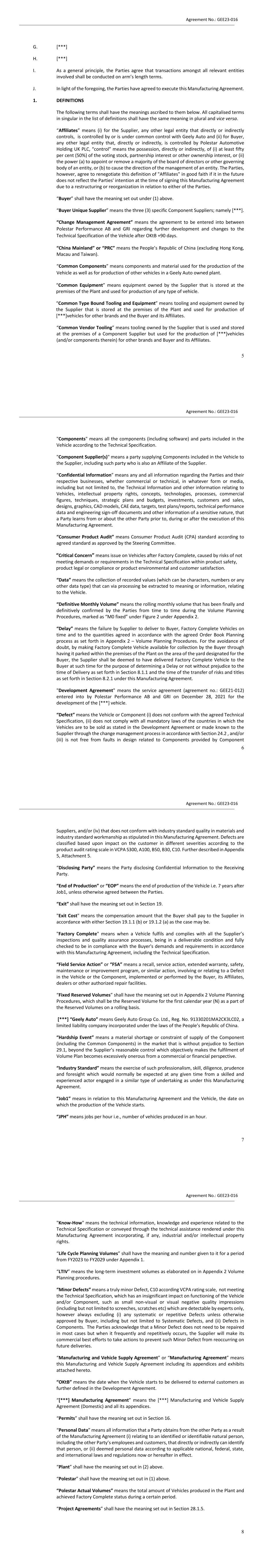 Agreement No.: GEE23-016 5 G. [***] H. [***] I. As a general principle, the Parties agree that transactions amongst all relevant entities involved shall be conducted on arm’s length terms. J. In light of the foregoing, the Parties have agreed to execute this Manufacturing Agreement. 1. DEFINITIONS The following terms shall have the meanings ascribed to them below. All capitalised terms in singular in the list of definitions shall have the same meaning in plural and vice versa. “Affiliates” means (i) for the Supplier, any other legal entity that directly or indirectly controls, is controlled by or is under common control with Geely Auto and (ii) for Buyer, any other legal entity that, directly or indirectly, is controlled by Polestar Automotive Holding UK PLC, “control” means the possession, directly or indirectly, of (i) at least fifty per cent (50%) of the voting stock, partnership interest or other ownership interest, or (ii) the power (a) to appoint or remove a majority of the board of directors or other governing body of an entity, or (b) to cause the direction of the management of an entity. The Parties, however, agree to renegotiate this definition of "Affiliates" in good faith if it in the future does not reflect the Parties' intention at the time of signing this Manufacturing Agreement due to a restructuring or reorganization in relation to either of the Parties. “Buyer” shall have the meaning set out under (1) above. “Buyer Unique Supplier” means the three (3) specific Component Suppliers; namely [***]. “Change Management Agreement” means the agreement to be entered into between Polestar Performance AB and GRI regarding further development and changes to the Technical Specification of the Vehicle after OKtB +90 days. “China Mainland” or “PRC” means the People’s Republic of China (excluding Hong Kong, Macau and Taiwan). “Common Components” means components and material used for the production of the Vehicle as well as for production of other vehicles in a Geely Auto owned plant. “Common Equipment” means equipment owned by the Supplier that is stored at the premises of the Plant and used for production of any type of vehicle. “Common Type Bound Tooling and Equipment” means tooling and equipment owned by the Supplier that is stored at the premises of the Plant and used for production of [***]vehicles for other brands and the Buyer and its Affiliates. “Common Vendor Tooling” means tooling owned by the Supplier that is used and stored at the premises of a Component Supplier but used for the production of [***]vehicles (and/or components therein) for other brands and Buyer and its Affiliates. Agreement No.: GEE23-016 6 "Components" means all the components (including software) and parts included in the Vehicle according to the Technical Specification. "Component Supplier(s)" means a party supplying Components included in the Vehicle to the Supplier, including such party who is also an Affiliate of the Supplier. “Confidential Information” means any and all information regarding the Parties and their respective businesses, whether commercial or technical, in whatever form or media, including but not limited to, the Technical Information and other information relating to Vehicles, intellectual property rights, concepts, technologies, processes, commercial figures, techniques, strategic plans and budgets, investments, customers and sales, designs, graphics, CAD models, CAE data, targets, test plans/reports, technical performance data and engineering sign-off documents and other information of a sensitive nature, that a Party learns from or about the other Party prior to, during or after the execution of this Manufacturing Agreement. “Consumer Product Audit” means Consumer Product Audit (CPA) standard according to agreed standard as approved by the Steering Committee. “Critical Concern” means issue on Vehicles after Factory Complete, caused by risks of not meeting demands or requirements in the Technical Specification within product safety, product legal or compliance or product environmental and customer satisfaction. “Data” means the collection of recorded values (which can be characters, numbers or any other data type) that can via processing be extracted to meaning or information, relating to the Vehicle. “Definitive Monthly Volume” means the rolling monthly volume that has been finally and definitively confirmed by the Parties from time to time during the Volume Planning Procedures, marked as “M0 fixed” under Figure 2 under Appendix 2. “Delay” means the failure by Supplier to deliver to Buyer, Factory Complete Vehicles on time and to the quantities agreed in accordance with the agreed Order Book Planning process as set forth in Appendix 2 – Volume Planning Procedures. For the avoidance of doubt, by making Factory Complete Vehicle available for collection by the Buyer through having it parked within the premises of the Plant on the area of the yard designated for the Buyer, the Supplier shall be deemed to have delivered Factory Complete Vehicle to the Buyer at such time for the purpose of determining a Delay or not without prejudice to the time of Delivery as set forth in Section 8.1.1 and the time of the transfer of risks and titles as set forth in Section 8.2.1 under this Manufacturing Agreement. "Development Agreement" means the service agreement (agreement no.: GEE21-012) entered into by Polestar Performance AB and GRI on December 28, 2021 for the development of the [***] vehicle. “Defect” means the Vehicle or Component (i) does not conform with the agreed Technical Specification, (ii) does not comply with all mandatory laws of the countries in which the Vehicles are to be sold as stated in the Development Agreement or made known to the Supplier through the change management process in accordance with Section 24.2 , and/or (iii) is not free from faults in design related to Components provided by Compo