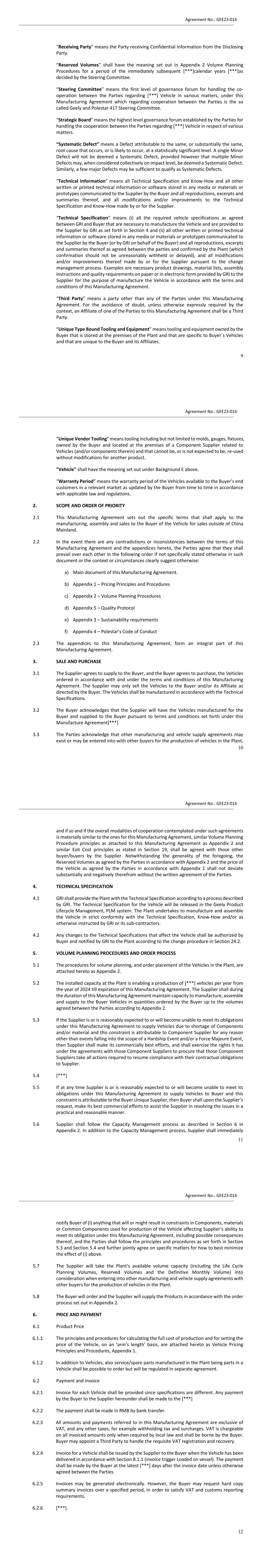 Agreement No.: GEE23-016 9 “Receiving Party” means the Party receiving Confidential Information from the Disclosing Party. “Reserved Volumes” shall have the meaning set out in Appendix 2 Volume Planning Procedures for a period of the immediately subsequent [***]calendar years [***]as decided by the Steering Committee. “Steering Committee” means the first level of governance forum for handling the co- operation between the Parties regarding [***] Vehicle in various matters, under this Manufacturing Agreement which regarding cooperation between the Parties is the so called Geely and Polestar 417 Steering Committee. “Strategic Board” means the highest level governance forum established by the Parties for handling the cooperation between the Parties regarding [***] Vehicle in respect of various matters. “Systematic Defect” means a Defect attributable to the same, or substantially the same, root cause that occurs, or is likely to occur, at a statistically significant level. A single Minor Defect will not be deemed a Systematic Defect, provided however that multiple Minor Defects may, when considered collectively on impact level, be deemed a Systematic Defect. Similarly, a few major Defects may be sufficient to qualify as Systematic Defects. "Technical Information" means all Technical Specification and Know-How and all other written or printed technical information or software stored in any media or materials or prototypes communicated to the Supplier by the Buyer and all reproductions, excerpts and summaries thereof, and all modifications and/or improvements to the Technical Specification and Know-How made by or for the Supplier. “Technical Specification” means (i) all the required vehicle specifications as agreed between GRI and Buyer that are necessary to manufacture the Vehicle and are provided to the Supplier by GRI as set forth in Section 4 and (ii) all other written or printed technical information or software stored in any media or materials or prototypes communicated to the Supplier by the Buyer (or by GRI on behalf of the Buyer) and all reproductions, excerpts and summaries thereof as agreed between the parties and confirmed by the Plant (which confirmation should not be unreasonably withheld or delayed), and all modifications and/or improvements thereof made by or for the Supplier pursuant to the change management process. Examples are necessary product drawings, material lists, assembly instructions and quality requirements on paper or in electronic form provided by GRI to the Supplier for the purpose of manufacture the Vehicle in accordance with the terms and conditions of this Manufacturing Agreement. “Third Party” means a party other than any of the Parties under this Manufacturing Agreement. For the avoidance of doubt, unless otherwise expressly required by the context, an Affiliate of one of the Parties to this Manufacturing Agreement shall be a Third Party. “Unique Type Bound Tooling and Equipment” means tooling and equipment owned by the Buyer that is stored at the premises of the Plant and that are specific to Buyer´s Vehicles and that are unique to the Buyer and its Affiliates. Agreement No.: GEE23-016 10 “Unique Vendor Tooling” means tooling including but not limited to molds, gauges, fixtures, owned by the Buyer and located at the premises of a Component Supplier related to Vehicles (and/or components therein) and that cannot be, or is not expected to be, re-used without modifications for another product. "Vehicle" shall have the meaning set out under Background E above. “Warranty Period” means the warranty period of the Vehicles available to the Buyer’s end customers in a relevant market as updated by the Buyer from time to time in accordance with applicable law and regulations. 2. SCOPE AND ORDER OF PRIORITY 2.1 This Manufacturing Agreement sets out the specific terms that shall apply to the manufacturing, assembly and sales to the Buyer of the Vehicle for sales outside of China Mainland. 2.2 In the event there are any contradictions or inconsistencies between the terms of this Manufacturing Agreement and the appendices hereto, the Parties agree that they shall prevail over each other in the following order if not specifically stated otherwise in such document or the context or circumstances clearly suggest otherwise: a) Main document of this Manufacturing Agreement. b) Appendix 1 – Pricing Principles and Procedures c) Appendix 2 – Volume Planning Procedures d) Appendix 5 – Quality Protocol e) Appendix 3 – Sustainability requirements f) Appendix 4 – Polestar’s Code of Conduct 2.3 The appendices to this Manufacturing Agreement, form an integral part of this Manufacturing Agreement. 3. SALE AND PURCHASE 3.1 The Supplier agrees to supply to the Buyer, and the Buyer agrees to purchase, the Vehicles ordered in accordance with and under the terms and conditions of this Manufacturing Agreement. The Supplier may only sell the Vehicles to the Buyer and/or its Affiliate as directed by the Buyer. The Vehicles shall be manufactured in accordance with the Technical Specifications. 3.2 The Buyer acknowledges that the Supplier will have the Vehicles manufactured for the Buyer and supplied to the Buyer pursuant to terms and conditions set forth under this Manufacture Agreement[***] 3.3 The Parties acknowledge that other manufacturing and vehicle supply agreements may exist or may be entered into with other buyers for the production of vehicles in the Plant, Agreement No.: GEE23-016 11 and if so and if the overall modalities of cooperation contemplated under such agreements is materially similar to the ones for this Manufacturing Agreement, similar Volume Planning Procedure principles as attached to this Manufacturing Agreement as Appendix 2 and similar Exit Cost principles as stated in Section 19, shall be agreed with those other buyer/buyers by the Supplier. Notwithstanding the generality of the foregoing, the Reserved Volumes as