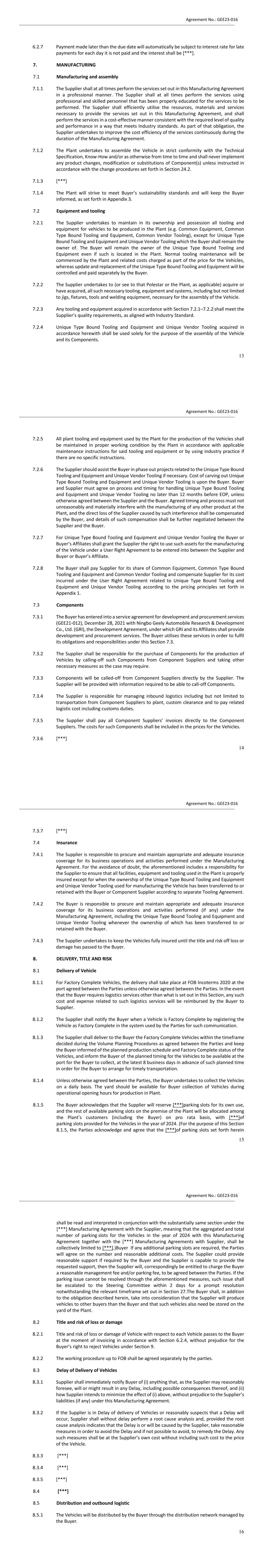 Agreement No.: GEE23-016 13 6.2.7 Payment made later than the due date will automatically be subject to interest rate for late payments for each day it is not paid and the interest shall be [***]. 7. MANUFACTURING 7.1 Manufacturing and assembly 7.1.1 The Supplier shall at all times perform the services set out in this Manufacturing Agreement in a professional manner. The Supplier shall at all times perform the services using professional and skilled personnel that has been properly educated for the services to be performed. The Supplier shall efficiently utilise the resources, materials and services necessary to provide the services set out in this Manufacturing Agreement, and shall perform the services in a cost-effective manner consistent with the required level of quality and performance in a way that meets Industry standards. As part of that obligation, the Supplier undertakes to improve the cost efficiency of the services continuously during the duration of the Manufacturing Agreement. 7.1.2 The Plant undertakes to assemble the Vehicle in strict conformity with the Technical Specification, Know-How and/or as otherwise from time to time and shall never implement any product changes, modification or substitutions of Component(s) unless instructed in accordance with the change procedures set forth in Section 24.2. 7.1.3 [***] 7.1.4 The Plant will strive to meet Buyer’s sustainability standards and will keep the Buyer informed, as set forth in Appendix 3. 7.2 Equipment and tooling 7.2.1 The Supplier undertakes to maintain in its ownership and possession all tooling and equipment for vehicles to be produced in the Plant (e.g. Common Equipment, Common Type Bound Tooling and Equipment, Common Vendor Tooling), except for Unique Type Bound Tooling and Equipment and Unique Vendor Tooling which the Buyer shall remain the owner of. The Buyer will remain the owner of the Unique Type Bound Tooling and Equipment even if such is located in the Plant. Normal tooling maintenance will be commenced by the Plant and related costs charged as part of the price for the Vehicles, whereas update and replacement of the Unique Type Bound Tooling and Equipment will be controlled and paid separately by the Buyer. 7.2.2 The Supplier undertakes to (or see to that Polestar or the Plant, as applicable) acquire or have acquired, all such necessary tooling, equipment and systems, including but not limited to jigs, fixtures, tools and welding equipment, necessary for the assembly of the Vehicle. 7.2.3 Any tooling and equipment acquired in accordance with Section 7.2.1–7.2.2 shall meet the Supplier’s quality requirements, as aligned with Industry Standard. 7.2.4 Unique Type Bound Tooling and Equipment and Unique Vendor Tooling acquired in accordance herewith shall be used solely for the purpose of the assembly of the Vehicle and its Components. Agreement No.: GEE23-016 14 7.2.5 All plant tooling and equipment used by the Plant for the production of the Vehicles shall be maintained in proper working condition by the Plant in accordance with applicable maintenance instructions for said tooling and equipment or by using industry practice if there are no specific instructions. 7.2.6 The Supplier should assist the Buyer in phase out projects related to the Unique Type Bound Tooling and Equipment and Unique Vendor Tooling if necessary. Cost of carving out Unique Type Bound Tooling and Equipment and Unique Vendor Tooling is upon the Buyer. Buyer and Supplier must agree on process and timing for handling Unique Type Bound Tooling and Equipment and Unique Vendor Tooling no later than 12 months before EOP, unless otherwise agreed between the Supplier and the Buyer. Agreed timing and process must not unreasonably and materially interfere with the manufacturing of any other product at the Plant, and the direct loss of the Supplier caused by such interference shall be compensated by the Buyer, and details of such compensation shall be further negotiated between the Supplier and the Buyer. 7.2.7 For Unique Type Bound Tooling and Equipment and Unique Vendor Tooling the Buyer or Buyer’s Affiliates shall grant the Supplier the right to use such assets for the manufacturing of the Vehicle under a User Right Agreement to be entered into between the Supplier and Buyer or Buyer’s Affiliate. 7.2.8 The Buyer shall pay Supplier for its share of Common Equipment, Common Type Bound Tooling and Equipment and Common Vendor Tooling and compensate Supplier for its cost incurred under the User Right Agreement related to Unique Type Bound Tooling and Equipment and Unique Vendor Tooling according to the pricing principles set forth in Appendix 1. 7.3 Components 7.3.1 The Buyer has entered into a service agreement for development and procurement services (GEE21-012), December 28, 2021 with Ningbo Geely Automobile Research & Development Co., Ltd. (GRI), the Development Agreement, under which GRI and its Affiliates shall provide development and procurement services. The Buyer utilises these services in order to fulfil its obligations and responsibilities under this Section 7.3. 7.3.2 The Supplier shall be responsible for the purchase of Components for the production of Vehicles by calling-off such Components from Component Suppliers and taking other necessary measures as the case may require. 7.3.3 Components will be called-off from Component Suppliers directly by the Supplier. The Supplier will be provided with information required to be able to call-off Components. 7.3.4 The Supplier is responsible for managing inbound logistics including but not limited to transportation from Component Suppliers to plant, custom clearance and to pay related logistic cost including customs duties. 7.3.5 The Supplier shall pay all Component Suppliers’ invoices directly to the Component Suppliers. The costs for such Components shall be included in the prices for the Vehicles. 7.3.6 [***] Agreement No.: GEE23-016 15 7.3.7 [***] 7.4 Insurance 7.4.1 The Supplier 