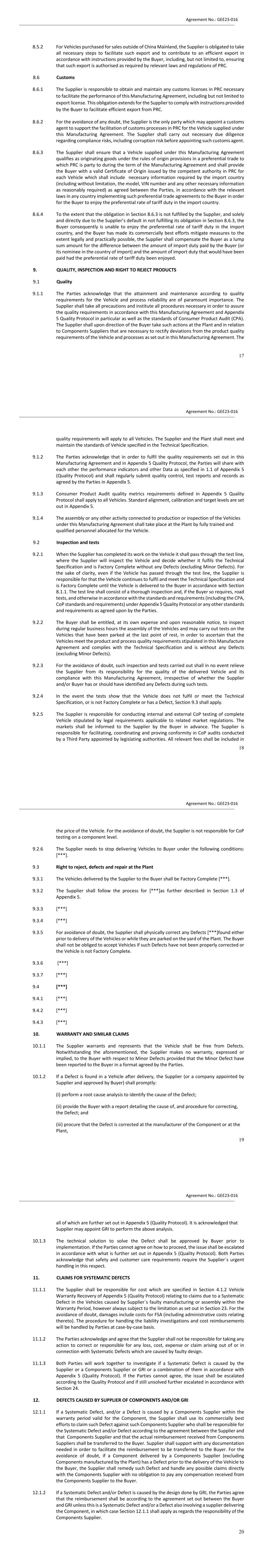 Agreement No.: GEE23-016 17 8.5.2 For Vehicles purchased for sales outside of China Mainland, the Supplier is obligated to take all necessary steps to facilitate such export and to contribute to an efficient export in accordance with instructions provided by the Buyer, including, but not limited to, ensuring that such export is authorised as required by relevant laws and regulations of PRC. 8.6 Customs 8.6.1 The Supplier is responsible to obtain and maintain any customs licenses in PRC necessary to facilitate the performance of this Manufacturing Agreement, including but not limited to export license. This obligation extends for the Supplier to comply with instructions provided by the Buyer to facilitate efficient export from PRC. 8.6.2 For the avoidance of any doubt, the Supplier is the only party which may appoint a customs agent to support the facilitation of customs processes in PRC for the Vehicle supplied under this Manufacturing Agreement. The Supplier shall carry out necessary due diligence regarding compliance risks, including corruption risk before appointing such customs agent. 8.6.3 The Supplier shall ensure that a Vehicle supplied under this Manufacturing Agreement qualifies as originating goods under the rules of origin provisions in a preferential trade to which PRC is party to during the term of the Manufacturing Agreement and shall provide the Buyer with a valid Certificate of Origin issued by the competent authority in PRC for each Vehicle which shall include necessary information required by the import country (including without limitation, the model, VIN number and any other necessary information as reasonably required) as agreed between the Parties, in accordance with the relevant laws in any country implementing such preferential trade agreements to the Buyer in order for the Buyer to enjoy the preferential rate of tariff duty in the import country. 8.6.4 To the extent that the obligation in Section 8.6.3 is not fulfilled by the Supplier, and solely and directly due to the Supplier’s default in not fulfilling its obligation in Section 8.6.3, the Buyer consequently is unable to enjoy the preferential rate of tariff duty in the import country, and the Buyer has made its commercially best efforts mitigate measures to the extent legally and practically possible, the Supplier shall compensate the Buyer as a lump sum amount for the difference between the amount of import duty paid by the Buyer (or its nominee in the country of import) and the amount of import duty that would have been paid had the preferential rate of tariff duty been enjoyed. 9. QUALITY, INSPECTION AND RIGHT TO REJECT PRODUCTS 9.1 Quality 9.1.1 The Parties acknowledge that the attainment and maintenance according to quality requirements for the Vehicle and process reliability are of paramount importance. The Supplier shall take all precautions and institute all procedures necessary in order to assure the quality requirements in accordance with this Manufacturing Agreement and Appendix 5 Quality Protocol in particular as well as the standards of Consumer Product Audit (CPA). The Supplier shall upon direction of the Buyer take such actions at the Plant and in relation to Components Suppliers that are necessary to rectify deviations from the product quality requirements of the Vehicle and processes as set out in this Manufacturing Agreement. The Agreement No.: GEE23-016 18 quality requirements will apply to all Vehicles. The Supplier and the Plant shall meet and maintain the standards of Vehicle specified in the Technical Specification. 9.1.2 The Parties acknowledge that in order to fulfil the quality requirements set out in this Manufacturing Agreement and in Appendix 5 Quality Protocol, the Parties will share with each other the performance indicators and other Data as specified in 1.1 of Appendix 5 (Quality Protocol) and shall regularly submit quality control, test reports and records as agreed by the Parties in Appendix 5. 9.1.3 Consumer Product Audit quality metrics requirements defined in Appendix 5 Quality Protocol shall apply to all Vehicles. Standard alignment, calibration and target levels are set out in Appendix 5. 9.1.4 The assembly or any other activity connected to production or inspection of the Vehicles under this Manufacturing Agreement shall take place at the Plant by fully trained and qualified personnel allocated for the Vehicle. 9.2 Inspection and tests 9.2.1 When the Supplier has completed its work on the Vehicle it shall pass through the test line, where the Supplier will inspect the Vehicle and decide whether it fulfils the Technical Specification and is Factory Complete without any Defects (excluding Minor Defects). For the sake of clarity, even if the Vehicle has passed through the test line, the Supplier is responsible for that the Vehicle continues to fulfil and meet the Technical Specification and is Factory Complete until the Vehicle is delivered to the Buyer in accordance with Section 8.1.1. The test line shall consist of a thorough inspection and, if the Buyer so requires, road tests, and otherwise in accordance with the standards and requirements (including the CPA, CoP standards and requirements) under Appendix 5 Quality Protocol or any other standards and requirements as agreed upon by the Parties. 9.2.2 The Buyer shall be entitled, at its own expense and upon reasonable notice, to inspect during regular business hours the assembly of the Vehicles and may carry out tests on the Vehicles that have been parked at the last point of rest, in order to ascertain that the Vehicles meet the product and process quality requirements stipulated in this Manufacture Agreement and complies with the Technical Specification and is without any Defects (excluding Minor Defects). 9.2.3 For the avoidance of doubt, such inspection and tests carried out shall in no event relieve the Supplier from its responsibility for the quality of the delivered Vehicle and its compliance with this Manufact