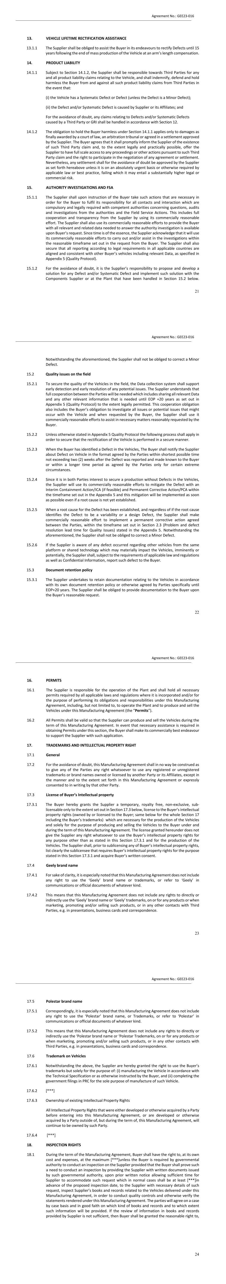 Agreement No.: GEE23-016 21 13. VEHICLE LIFETIME RECTIFICATION ASSISTANCE 13.1.1 The Supplier shall be obliged to assist the Buyer in its endeavours to rectify Defects until 15 years following the end of mass production of the Vehicle at an arm’s length compensation. 14. PRODUCT LIABILITY 14.1.1 Subject to Section 14.1.2, the Supplier shall be responsible towards Third Parties for any and all product liability claims relating to the Vehicle, and shall indemnify, defend and hold harmless the Buyer from and against all such product liability claims from Third Parties in the event that: (i) the Vehicle has a Systematic Defect or Defect (unless the Defect is a Minor Defect); (ii) the Defect and/or Systematic Defect is caused by Supplier or its Affiliates; and For the avoidance of doubt, any claims relating to Defects and/or Systematic Defects caused by a Third Party or GRI shall be handled in accordance with Section 12. 14.1.2 The obligation to hold the Buyer harmless under Section 14.1.1 applies only to damages as finally awarded by a court of law, an arbitration tribunal or agreed in a settlement approved by the Supplier. The Buyer agrees that it shall promptly inform the Supplier of the existence of such Third Party claim and, to the extent legally and practically possible, offer the Supplier to have full scale access to any proceedings or other actions pursuant to such Third Party claim and the right to participate in the negotiation of any agreement or settlement. Nevertheless, any settlement shall for the avoidance of doubt be approved by the Supplier as set forth hereabove unless it is on an absolutely urgent basis or otherwise required by applicable law or best practice, failing which it may entail a substantially higher legal or commercial risk. 15. AUTHORITY INVESTIGATIONS AND FSA 15.1.1 The Supplier shall upon instruction of the Buyer take such actions that are necessary in order for the Buyer to fulfil its responsibility for all contacts and interaction which are compulsory and legally required with competent authorities concerning questions, audits and investigations from the authorities and the Field Service Actions. This includes full cooperation and transparency from the Supplier by using its commercially reasonable effort. The Supplier shall also use its commercially reasonable efforts to provide the Buyer with all relevant and related data needed to answer the authority investigation is available upon Buyer’s request. Since time is of the essence, the Supplier acknowledge that it will use its commercially reasonable efforts to carry out and/or assist in the investigations within the reasonable timeframe set out in the request from the Buyer. The Supplier shall also secure that all reporting according to legal requirements in all applicable countries are aligned and consistent with other Buyer’s vehicles including relevant Data, as specified in Appendix 5 (Quality Protocol). 15.1.2 For the avoidance of doubt, it is the Supplier’s responsibility to propose and develop a solution for any Defect and/or Systematic Defect and implement such solution with the Components Supplier or at the Plant that have been handled in Section 15.2 below. Agreement No.: GEE23-016 22 Notwithstanding the aforementioned, the Supplier shall not be obliged to correct a Minor Defect. 15.2 Quality issues on the field 15.2.1 To secure the quality of the Vehicles in the field, the Data collection system shall support early detection and early resolution of any potential issues. The Supplier understands that full cooperation between the Parties will be needed which includes sharing all relevant Data and any other relevant information that is needed until EOP +20 years as set out in Appendix 5 (Quality Protocol) to the extent legally permitted. This cooperation obligation also includes the Buyer’s obligation to investigate all issues or potential issues that might occur with the Vehicle and when requested by the Buyer, the Supplier shall use it commercially reasonable efforts to assist in necessary matters reasonably requested by the Buyer. 15.2.2 Unless otherwise stated in Appendix 5 Quality Protocol the following process shall apply in order to secure that the rectification of the Vehicle is performed in a secure manner. 15.2.3 When the Buyer has identified a Defect in the Vehicles, The Buyer shall notify the Supplier about Defect on Vehicle in the format agreed by the Parties within shortest possible time not exceeding two (2) weeks after the Defect was reported and made known to the Buyer or within a longer time period as agreed by the Parties only for certain extreme circumstances. 15.2.4 Since it is in both Parties interest to secure a production without Defects in the Vehicles, the Supplier will use its commercially reasonable efforts to mitigate the Defect with an Interim Containment Action/ICA (if feasible) and Permanent Corrective Action/PCA within the timeframe set out in the Appendix 5 and this mitigation will be implemented as soon as possible even if a root cause is not yet established. 15.2.5 When a root cause for the Defect has been established, and regardless of if the root cause identifies the Defect to be a variability or a design Defect, the Supplier shall make commercially reasonable effort to implement a permanent corrective action agreed between the Parties, within the timeframe set out in Section 2.3 (Problem and defect resolution lead time for Quality Issues) stated in the Appendix 5. Notwithstanding the aforementioned, the Supplier shall not be obliged to correct a Minor Defect. 15.2.6 If the Supplier is aware of any defect occurred regarding other vehicles from the same platform or shared technology which may materially impact the Vehicles, imminently or potentially, the Supplier shall, subject to the requirements of applicable law and regulations as well as Confidential Information, report such defect to the Buyer. 15.3 Document retention policy 15.3.1 The Supplier unde