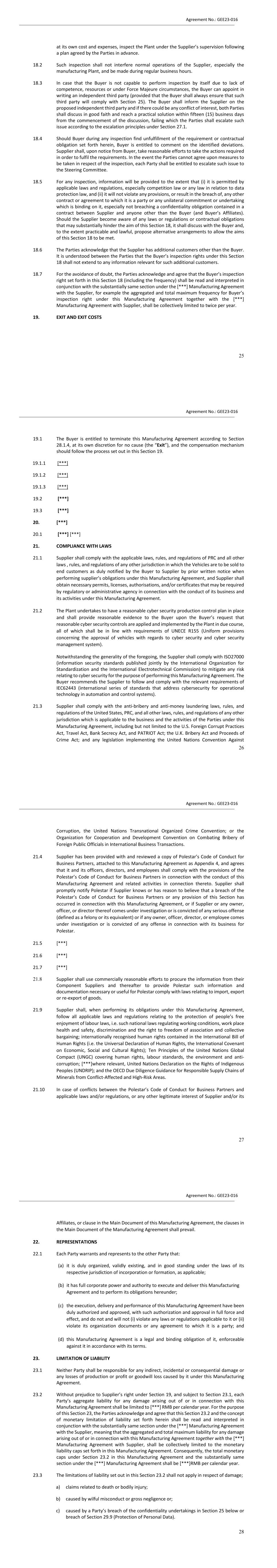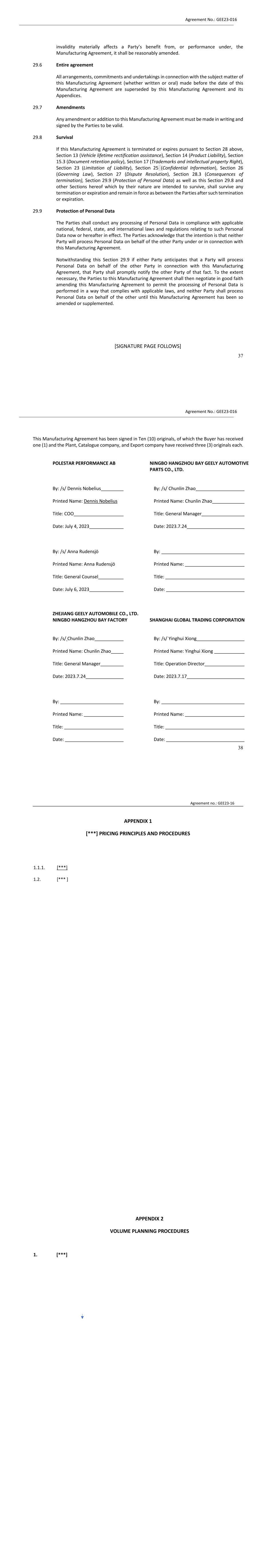 Agreement No.: GEE23-016 37 invalidity materially affects a Party’s benefit from, or performance under, the Manufacturing Agreement, it shall be reasonably amended. 29.6 Entire agreement All arrangements, commitments and undertakings in connection with the subject matter of this Manufacturing Agreement (whether written or oral) made before the date of this Manufacturing Agreement are superseded by this Manufacturing Agreement and its Appendices. 29.7 Amendments Any amendment or addition to this Manufacturing Agreement must be made in writing and signed by the Parties to be valid. 29.8 Survival If this Manufacturing Agreement is terminated or expires pursuant to Section 28 above, Section 13 (Vehicle lifetime rectification assistance), Section 14 (Product Liability), Section 15.3 (Document retention policy), Section 17 (Trademarks and intellectual property Right), Section 23 (Limitation of Liability), Section 25 (Confidential Information), Section 26 (Governing Law), Section 27 (Dispute Resolution), Section 28.3 (Consequences of termination), Section 29.9 (Protection of Personal Data) as well as this Section 29.8 and other Sections hereof which by their nature are intended to survive, shall survive any termination or expiration and remain in force as between the Parties after such termination or expiration. 29.9 Protection of Personal Data The Parties shall conduct any processing of Personal Data in compliance with applicable national, federal, state, and international laws and regulations relating to such Personal Data now or hereafter in effect. The Parties acknowledge that the intention is that neither Party will process Personal Data on behalf of the other Party under or in connection with this Manufacturing Agreement. Notwithstanding this Section 29.9 if either Party anticipates that a Party will process Personal Data on behalf of the other Party in connection with this Manufacturing Agreement, that Party shall promptly notify the other Party of that fact. To the extent necessary, the Parties to this Manufacturing Agreement shall then negotiate in good faith amending this Manufacturing Agreement to permit the processing of Personal Data is performed in a way that complies with applicable laws, and neither Party shall process Personal Data on behalf of the other until this Manufacturing Agreement has been so amended or supplemented. [SIGNATURE PAGE FOLLOWS] Agreement No.: GEE23-016 38 This Manufacturing Agreement has been signed in Ten (10) originals, of which the Buyer has received one (1) and the Plant, Catalogue company, and Export company have received three (3) originals each. POLESTAR PERFORMANCE AB NINGBO HANGZHOU BAY GEELY AUTOMOTIVE PARTS CO., LTD. By: /s/ Dennis Nobelius By: /s/ Chunlin Zhao Printed Name: Dennis Nobelius Printed Name: Chunlin Zhao Title: COO Title: General Manager Date: July 4, 2023 Date: 2023.7.24 By: /s/ Anna Rudensjö By: Printed Name: Anna Rudensjö Printed Name: Title: General Counsel Title: Date: July 6, 2023 Date: ZHEJIANG GEELY AUTOMOBILE CO., LTD. NINGBO HANGZHOU BAY FACTORY SHANGHAI GLOBAL TRADING CORPORATION By: /s/ Chunlin Zhao By: /s/ Yinghui Xiong Printed Name: Chunlin Zhao Printed Name: Yinghui Xiong Title: General Manager Title: Operation Director Date: 2023.7.24 Date: 2023.7.17 By: By: Printed Name: Printed Name: Title: Title: Date: Date: Agreement no.: GEE23-16 APPENDIX 1 [***] PRICING PRINCIPLES AND PROCEDURES 1.1.1. [***] 1.2. [*** ] APPENDIX 2 VOLUME PLANNING PROCEDURES 1. [***]