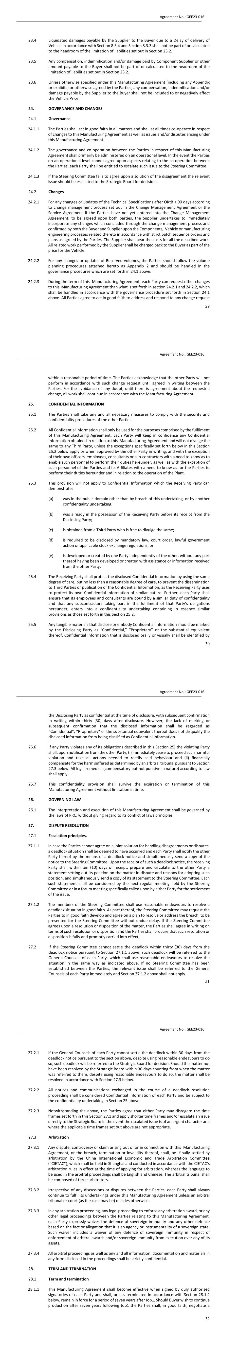 Agreement No.: GEE23-016 29 23.4 Liquidated damages payable by the Supplier to the Buyer due to a Delay of delivery of Vehicle in accordance with Section 8.3.4 and Section 8.3.3 shall not be part of or calculated to the headroom of the limitation of liabilities set out in Section 23.2. 23.5 Any compensation, indemnification and/or damage paid by Component Supplier or other amount payable to the Buyer shall not be part of or calculated to the headroom of the limitation of liabilities set out in Section 23.2. 23.6 Unless otherwise specified under this Manufacturing Agreement (including any Appendix or exhibits) or otherwise agreed by the Parties, any compensation, indemnification and/or damage payable by the Supplier to the Buyer shall not be included to or negatively affect the Vehicle Price. 24. GOVERNANCE AND CHANGES 24.1 Governance 24.1.1 The Parties shall act in good faith in all matters and shall at all times co-operate in respect of changes to this Manufacturing Agreement as well as issues and/or disputes arising under this Manufacturing Agreement. 24.1.2 The governance and co-operation between the Parties in respect of this Manufacturing Agreement shall primarily be administered on an operational level. In the event the Parties on an operational level cannot agree upon aspects relating to the co-operation between the Parties, each Party shall be entitled to escalate such issue to the Steering Committee. 24.1.3 If the Steering Committee fails to agree upon a solution of the disagreement the relevant issue should be escalated to the Strategic Board for decision. 24.2 Changes 24.2.1 For any changes or updates of the Technical Specifications after OKtB + 90 days according to change management process set out in the Change Management Agreement or the Service Agreement if the Parties have not yet entered into the Change Management Agreement, to be agreed upon both parties, the Supplier undertakes to immediately incorporate any changes which concluded through the change management process and confirmed by both the Buyer and Supplier upon the Components, Vehicle or manufacturing engineering processes related thereto in accordance with strict batch sequence orders and plans as agreed by the Parties. The Supplier shall bear the costs for all the described work. All related work performed by the Supplier shall be charged back to the Buyer as part of the price for the Vehicle. 24.2.2 For any changes or updates of Reserved volumes, the Parties should follow the volume planning procedures attached hereto as Appendix 2 and should be handled in the governance procedures which are set forth in 24.1 above. 24.2.3 During the term of this Manufacturing Agreement, each Party can request other changes to this Manufacturing Agreement than what is set forth in section 24.2.1 and 24.2.2, which shall be handled in accordance with the governance procedure set forth in Section 24.1 above. All Parties agree to act in good faith to address and respond to any change request Agreement No.: GEE23-016 30 within a reasonable period of time. The Parties acknowledge that the other Party will not perform in accordance with such change request until agreed in writing between the Parties. For the avoidance of any doubt, until there is agreement about the requested change, all work shall continue in accordance with the Manufacturing Agreement. 25. CONFIDENTIAL INFORMATION 25.1 The Parties shall take any and all necessary measures to comply with the security and confidentiality procedures of the other Parties. 25.2 All Confidential Information shall only be used for the purposes comprised by the fulfilment of this Manufacturing Agreement. Each Party will keep in confidence any Confidential Information obtained in relation to this Manufacturing Agreement and will not divulge the same to any Third Party, unless the exceptions specifically set forth below in this Section 25.2 below apply or when approved by the other Party in writing, and with the exception of their own officers, employees, consultants or sub-contractors with a need to know as to enable such personnel to perform their duties hereunder, as well as with the exception of such personnel of the Parties and its Affiliates with a need to know as for the Parties to perform their duties hereunder and in relation to the operation of the Plant. 25.3 This provision will not apply to Confidential Information which the Receiving Party can demonstrate: (a) was in the public domain other than by breach of this undertaking, or by another confidentiality undertaking; (b) was already in the possession of the Receiving Party before its receipt from the Disclosing Party; (c) is obtained from a Third Party who is free to divulge the same; (d) is required to be disclosed by mandatory law, court order, lawful government action or applicable stock exchange regulations; or (e) is developed or created by one Party independently of the other, without any part thereof having been developed or created with assistance or information received from the other Party. 25.4 The Receiving Party shall protect the disclosed Confidential Information by using the same degree of care, but no less than a reasonable degree of care, to prevent the dissemination to Third Parties or publication of the Confidential Information, as the Receiving Party uses to protect its own Confidential Information of similar nature. Further, each Party shall ensure that its employees and consultants are bound by a similar duty of confidentiality and that any subcontractors taking part in the fulfilment of that Party’s obligations hereunder, enters into a confidentiality undertaking containing in essence similar provisions as those set forth in this Section 25.2. 25.5 Any tangible materials that disclose or embody Confidential Information should be marked by the Disclosing Party as “Confidential,” “Proprietary” or the substantial equivalent thereof. Confidential Information that is disclosed orally or visually sha