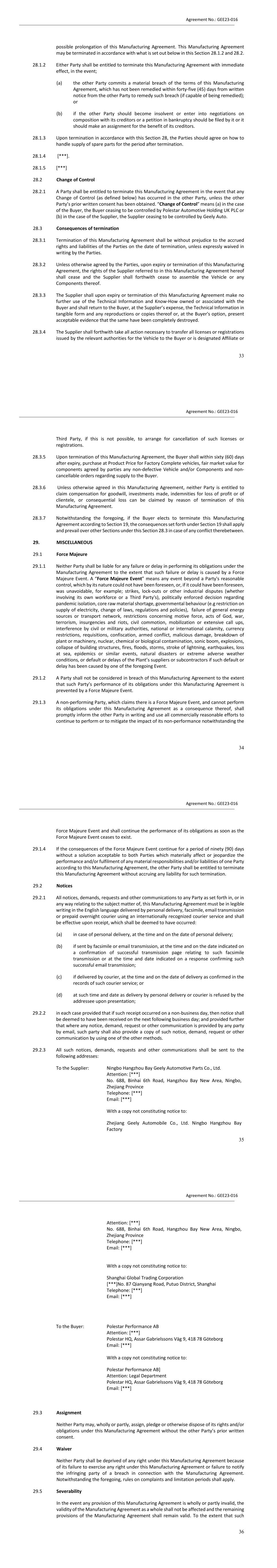 Agreement No.: GEE23-016 33 possible prolongation of this Manufacturing Agreement. This Manufacturing Agreement may be terminated in accordance with what is set out below in this Section 28.1.2 and 28.2. 28.1.2 Either Party shall be entitled to terminate this Manufacturing Agreement with immediate effect, in the event; (a) the other Party commits a material breach of the terms of this Manufacturing Agreement, which has not been remedied within forty-five (45) days from written notice from the other Party to remedy such breach (if capable of being remedied); or (b) if the other Party should become insolvent or enter into negotiations on composition with its creditors or a petition in bankruptcy should be filed by it or it should make an assignment for the benefit of its creditors. 28.1.3 Upon termination in accordance with this Section 28, the Parties should agree on how to handle supply of spare parts for the period after termination. 28.1.4 [***]. 28.1.5 [***] 28.2 Change of Control 28.2.1 A Party shall be entitled to terminate this Manufacturing Agreement in the event that any Change of Control (as defined below) has occurred in the other Party, unless the other Party’s prior written consent has been obtained. “Change of Control” means (a) in the case of the Buyer, the Buyer ceasing to be controlled by Polestar Automotive Holding UK PLC or (b) in the case of the Supplier, the Supplier ceasing to be controlled by Geely Auto. 28.3 Consequences of termination 28.3.1 Termination of this Manufacturing Agreement shall be without prejudice to the accrued rights and liabilities of the Parties on the date of termination, unless expressly waived in writing by the Parties. 28.3.2 Unless otherwise agreed by the Parties, upon expiry or termination of this Manufacturing Agreement, the rights of the Supplier referred to in this Manufacturing Agreement hereof shall cease and the Supplier shall forthwith cease to assemble the Vehicle or any Components thereof. 28.3.3 The Supplier shall upon expiry or termination of this Manufacturing Agreement make no further use of the Technical Information and Know-How owned or associated with the Buyer and shall return to the Buyer, at the Supplier’s expense, the Technical Information in tangible form and any reproductions or copies thereof or, at the Buyer's option, present acceptable evidence that the same have been completely destroyed. 28.3.4 The Supplier shall forthwith take all action necessary to transfer all licenses or registrations issued by the relevant authorities for the Vehicle to the Buyer or is designated Affiliate or Agreement No.: GEE23-016 34 Third Party, if this is not possible, to arrange for cancellation of such licenses or registrations. 28.3.5 Upon termination of this Manufacturing Agreement, the Buyer shall within sixty (60) days after expiry, purchase at Product Price for Factory Complete vehicles, fair market value for components agreed by parties any non-defective Vehicle and/or Components and non- cancellable orders regarding supply to the Buyer. 28.3.6 Unless otherwise agreed in this Manufacturing Agreement, neither Party is entitled to claim compensation for goodwill, investments made, indemnities for loss of profit or of clientele, or consequential loss can be claimed by reason of termination of this Manufacturing Agreement. 28.3.7 Notwithstanding the foregoing, if the Buyer elects to terminate this Manufacturing Agreement according to Section 19, the consequences set forth under Section 19 shall apply and prevail over other Sections under this Section 28.3 in case of any conflict therebetween. 29. MISCELLANEOUS 29.1 Force Majeure 29.1.1 Neither Party shall be liable for any failure or delay in performing its obligations under the Manufacturing Agreement to the extent that such failure or delay is caused by a Force Majeure Event. A “Force Majeure Event” means any event beyond a Party's reasonable control, which by its nature could not have been foreseen, or, if it could have been foreseen, was unavoidable, for example; strikes, lock-outs or other industrial disputes (whether involving its own workforce or a Third Party's), politically enforced decision regarding pandemic isolation, core raw material shortage, governmental behaviour (e.g restriction on supply of electricity, change of laws, regulations and policies), failure of general energy sources or transport network, restrictions concerning motive force, acts of God, war, terrorism, insurgencies and riots, civil commotion, mobilization or extensive call ups, interference by civil or military authorities, national or international calamity, currency restrictions, requisitions, confiscation, armed conflict, malicious damage, breakdown of plant or machinery, nuclear, chemical or biological contamination, sonic boom, explosions, collapse of building structures, fires, floods, storms, stroke of lightning, earthquakes, loss at sea, epidemics or similar events, natural disasters or extreme adverse weather conditions, or default or delays of the Plant’s suppliers or subcontractors if such default or delay has been caused by one of the foregoing Event. 29.1.2 A Party shall not be considered in breach of this Manufacturing Agreement to the extent that such Party’s performance of its obligations under this Manufacturing Agreement is prevented by a Force Majeure Event. 29.1.3 A non-performing Party, which claims there is a Force Majeure Event, and cannot perform its obligations under this Manufacturing Agreement as a consequence thereof, shall promptly inform the other Party in writing and use all commercially reasonable efforts to continue to perform or to mitigate the impact of its non-performance notwithstanding the Agreement No.: GEE23-016 35 Force Majeure Event and shall continue the performance of its obligations as soon as the Force Majeure Event ceases to exist. 29.1.4 If the consequences of the Force Majeure Event continue for a period of ninety (90) days without a so