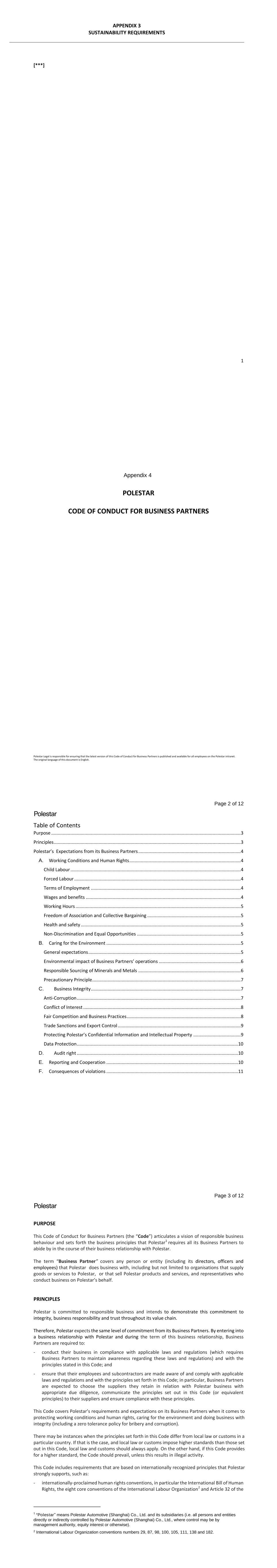 APPENDIX 3 SUSTAINABILITY REQUIREMENTS 1 [***] Polestar Legal is responsible for ensuring that the latest version of this Code of Conduct for Business Partners is published and available for all employees on the Polestar intranet. The original language of this document is English. POLESTAR CODE OF CONDUCT FOR BUSINESS PARTNERS Page 2 of 12 Table of Contents Purpose .................................................................................................................................................... 3 Principles .................................................................................................................................................. 3 Polestar’s Expectations from its Business Partners ................................................................................ 4 A. Working Conditions and Human Rights ....................................................................................... 4 Child Labour ..................................................................................................................................... 4 Forced Labour .................................................................................................................................. 4 Terms of Employment ..................................................................................................................... 4 Wages and benefits ......................................................................................................................... 4 Working Hours ................................................................................................................................. 5 Freedom of Association and Collective Bargaining ......................................................................... 5 Health and safety ............................................................................................................................. 5 Non-Discrimination and Equal Opportunities ................................................................................. 5 B. Caring for the Environment ......................................................................................................... 5 General expectations ....................................................................................................................... 5 Environmental impact of Business Partners’ operations ................................................................ 6 Responsible Sourcing of Minerals and Metals ................................................................................ 6 Precautionary Principle .................................................................................................................... 7 C. Business Integrity ..................................................................................................................... 7 Anti-Corruption ................................................................................................................................ 7 Conflict of Interest ........................................................................................................................... 8 Fair Competition and Business Practices ......................................................................................... 8 Trade Sanctions and Export Control ................................................................................................ 9 Protecting Polestar’s Confidential Information and Intellectual Property ..................................... 9 Data Protection ..............................................................................................................................10 D. Audit right ..............................................................................................................................10 E. Reporting and Cooperation .......................................................................................................10 F. Consequences of violations .......................................................................................................11 Page 3 of 12 PURPOSE This Code of Conduct for Business Partners (the “Code”) articulates a vision of responsible business behaviour and sets forth the business principles that Polestar1 requires all its Business Partners to abide by in the course of their business relationship with Polestar. The term “Business Partner” covers any person or entity (including its directors, officers and employees) that Polestar does business with, including but not limited to organisations that supply goods or services to Polestar, or that sell Polestar products and services, and representatives who conduct business on Polestar’s behalf. PRINCIPLES Polestar is committed to responsible business and intends to demonstrate this commitment to integrity, business responsibility and trust throughout its value chain. Therefore, Polestar expects the same level of commitment from its Business Partners. By entering into a business relationship with Polestar and during the term of this business relationship, Business Partners are required to: - conduct their business in compliance with applicable laws and regulations (which requires Business Partners to maintain awareness regarding these laws and regulations) and with the principles stated in this Code; and - ensure that their employees and subcontractors are made aware of and comply with applicable laws and regulations and with the principles set forth in this Code; in particular, Business Partners are expected to choose the suppliers they retain in relation with Polestar business with appropriate due diligence, communicate the principles set out in this Code (or equivalent principles) to their suppliers and ensure compliance with these principles. This Code covers Polestar’s requirements and expectations on its Business Partners when it comes to protecting working conditions and human rights, caring for the environm