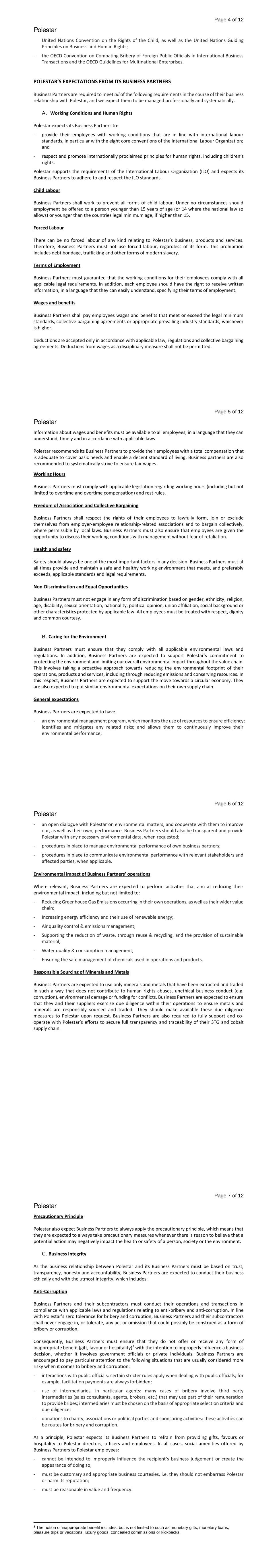 Page 4 of 12 United Nations Convention on the Rights of the Child, as well as the United Nations Guiding Principles on Business and Human Rights; - the OECD Convention on Combating Bribery of Foreign Public Officials in International Business Transactions and the OECD Guidelines for Multinational Enterprises. POLESTAR’S EXPECTATIONS FROM ITS BUSINESS PARTNERS Business Partners are required to meet all of the following requirements in the course of their business relationship with Polestar, and we expect them to be managed professionally and systematically. A. Working Conditions and Human Rights Polestar expects its Business Partners to: - provide their employees with working conditions that are in line with international labour standards, in particular with the eight core conventions of the International Labour Organization; and - respect and promote internationally proclaimed principles for human rights, including children’s rights. Polestar supports the requirements of the International Labour Organization (ILO) and expects its Business Partners to adhere to and respect the ILO standards. Child Labour Business Partners shall work to prevent all forms of child labour. Under no circumstances should employment be offered to a person younger than 15 years of age (or 14 where the national law so allows) or younger than the countries legal minimum age, if higher than 15. Forced Labour There can be no forced labour of any kind relating to Polestar’s business, products and services. Therefore, Business Partners must not use forced labour, regardless of its form. This prohibition includes debt bondage, trafficking and other forms of modern slavery. Terms of Employment Business Partners must guarantee that the working conditions for their employees comply with all applicable legal requirements. In addition, each employee should have the right to receive written information, in a language that they can easily understand, specifying their terms of employment. Wages and benefits Business Partners shall pay employees wages and benefits that meet or exceed the legal minimum standards, collective bargaining agreements or appropriate prevailing industry standards, whichever is higher. Deductions are accepted only in accordance with applicable law, regulations and collective bargaining agreements. Deductions from wages as a disciplinary measure shall not be permitted. Page 5 of 12 Information about wages and benefits must be available to all employees, in a language that they can understand, timely and in accordance with applicable laws. Polestar recommends its Business Partners to provide their employees with a total compensation that is adequate to cover basic needs and enable a decent standard of living. Business partners are also recommended to systematically strive to ensure fair wages. Working Hours Business Partners must comply with applicable legislation regarding working hours (including but not limited to overtime and overtime compensation) and rest rules. Freedom of Association and Collective Bargaining Business Partners shall respect the rights of their employees to lawfully form, join or exclude themselves from employer-employee relationship-related associations and to bargain collectively, where permissible by local laws. Business Partners must also ensure that employees are given the opportunity to discuss their working conditions with management without fear of retaliation. Health and safety Safety should always be one of the most important factors in any decision. Business Partners must at all times provide and maintain a safe and healthy working environment that meets, and preferably exceeds, applicable standards and legal requirements. Non-Discrimination and Equal Opportunities Business Partners must not engage in any form of discrimination based on gender, ethnicity, religion, age, disability, sexual orientation, nationality, political opinion, union affiliation, social background or other characteristics protected by applicable law. All employees must be treated with respect, dignity and common courtesy. B. Caring for the Environment Business Partners must ensure that they comply with all applicable environmental laws and regulations. In addition, Business Partners are expected to support Polestar’s commitment to protecting the environment and limiting our overall environmental impact throughout the value chain. This involves taking a proactive approach towards reducing the environmental footprint of their operations, products and services, including through reducing emissions and conserving resources. In this respect, Business Partners are expected to support the move towards a circular economy. They are also expected to put similar environmental expectations on their own supply chain. General expectations Business Partners are expected to have: - an environmental management program, which monitors the use of resources to ensure efficiency; identifies and mitigates any related risks; and allows them to continuously improve their environmental performance; Page 6 of 12 - an open dialogue with Polestar on environmental matters, and cooperate with them to improve our, as well as their own, performance. Business Partners should also be transparent and provide Polestar with any necessary environmental data, when requested; - procedures in place to manage environmental performance of own business partners; - procedures in place to communicate environmental performance with relevant stakeholders and affected parties, when applicable. Environmental impact of Business Partners’ operations Where relevant, Business Partners are expected to perform activities that aim at reducing their environmental impact, including but not limited to: - Reducing Greenhouse Gas Emissions occurring in their own operations, as well as their wider value chain; - Increasing energy efficiency and their use of renewable energy; - Air quality control & emissions management; - Supporting the reduction of wa