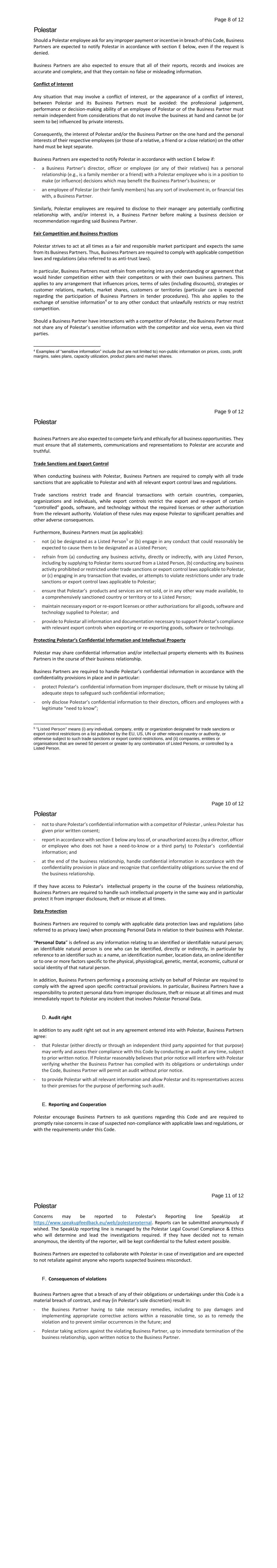 Page 8 of 12 Should a Polestar employee ask for any improper payment or incentive in breach of this Code, Business Partners are expected to notify Polestar in accordance with section E below, even if the request is denied. Business Partners are also expected to ensure that all of their reports, records and invoices are accurate and complete, and that they contain no false or misleading information. Conflict of Interest Any situation that may involve a conflict of interest, or the appearance of a conflict of interest, between Polestar and its Business Partners must be avoided: the professional judgement, performance or decision-making ability of an employee of Polestar or of the Business Partner must remain independent from considerations that do not involve the business at hand and cannot be (or seem to be) influenced by private interests. Consequently, the interest of Polestar and/or the Business Partner on the one hand and the personal interests of their respective employees (or those of a relative, a friend or a close relation) on the other hand must be kept separate. Business Partners are expected to notify Polestar in accordance with section E below if: - a Business Partner’s director, officer or employee (or any of their relatives) has a personal relationship (e.g., is a family member or a friend) with a Polestar employee who is in a position to make (or influence) decisions which may benefit the Business Partner’s business; or - an employee of Polestar (or their family members) has any sort of involvement in, or financial ties with, a Business Partner. Similarly, Polestar employees are required to disclose to their manager any potentially conflicting relationship with, and/or interest in, a Business Partner before making a business decision or recommendation regarding said Business Partner. Fair Competition and Business Practices Polestar strives to act at all times as a fair and responsible market participant and expects the same from its Business Partners. Thus, Business Partners are required to comply with applicable competition laws and regulations (also referred to as anti-trust laws). In particular, Business Partners must refrain from entering into any understanding or agreement that would hinder competition either with their competitors or with their own business partners. This applies to any arrangement that influences prices, terms of sales (including discounts), strategies or customer relations, markets, market shares, customers or territories (particular care is expected regarding the participation of Business Partners in tender procedures). This also applies to the exchange of sensitive information4 or to any other conduct that unlawfully restricts or may restrict competition. Should a Business Partner have interactions with a competitor of Polestar, the Business Partner must not share any of Polestar’s sensitive information with the competitor and vice versa, even via third parties. 4 Examples of “sensitive information” include (but are not limited to) non-public information on prices, costs, profit margins, sales plans, capacity utilization, product plans and market shares. Page 9 of 12 Business Partners are also expected to compete fairly and ethically for all business opportunities. They must ensure that all statements, communications and representations to Polestar are accurate and truthful. Trade Sanctions and Export Control When conducting business with Polestar, Business Partners are required to comply with all trade sanctions that are applicable to Polestar and with all relevant export control laws and regulations. Trade sanctions restrict trade and financial transactions with certain countries, companies, organizations and individuals, while export controls restrict the export and re-export of certain “controlled” goods, software, and technology without the required licenses or other authorization from the relevant authority. Violation of these rules may expose Polestar to significant penalties and other adverse consequences. Furthermore, Business Partners must (as applicable): - not (a) be designated as a Listed Person5 or (b) engage in any conduct that could reasonably be expected to cause them to be designated as a Listed Person; - refrain from (a) conducting any business activity, directly or indirectly, with any Listed Person, including by supplying to Polestar items sourced from a Listed Person, (b) conducting any business activity prohibited or restricted under trade sanctions or export control laws applicable to Polestar, or (c) engaging in any transaction that evades, or attempts to violate restrictions under any trade sanctions or export control laws applicable to Polestar; - ensure that Polestar’s products and services are not sold, or in any other way made available, to a comprehensively sanctioned country or territory or to a Listed Person; - maintain necessary export or re-export licenses or other authorizations for all goods, software and technology supplied to Polestar; and - provide to Polestar all information and documentation necessary to support Polestar’s compliance with relevant export controls when exporting or re-exporting goods, software or technology. Protecting Polestar’s Confidential Information and Intellectual Property Polestar may share confidential information and/or intellectual property elements with its Business Partners in the course of their business relationship. Business Partners are required to handle Polestar’s confidential information in accordance with the confidentiality provisions in place and in particular: - protect Polestar’s confidential information from improper disclosure, theft or misuse by taking all adequate steps to safeguard such confidential information; - only disclose Polestar’s confidential information to their directors, officers and employees with a legitimate “need to know”; 5 "Listed Person" means (i) any individual, company, entity or organization designated for tra
