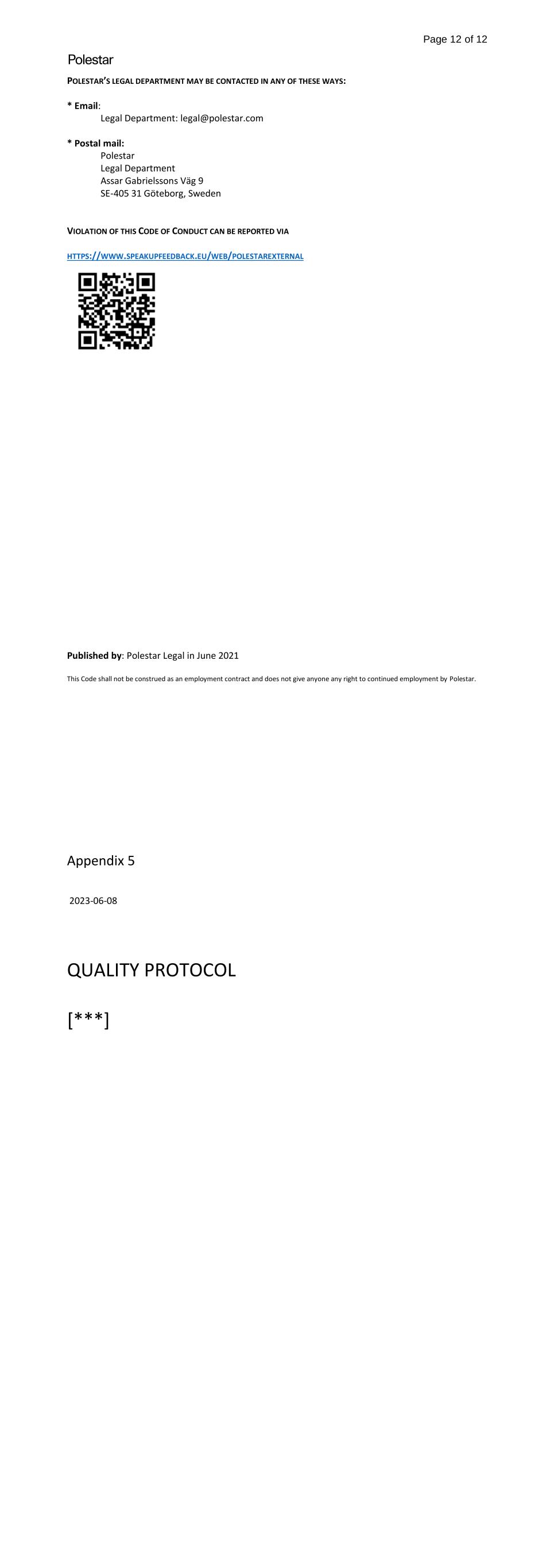 Page 12 of 12 POLESTAR’S LEGAL DEPARTMENT MAY BE CONTACTED IN ANY OF THESE WAYS: * Email: Legal Department: legal@polestar.com * Postal mail: Polestar Legal Department Assar Gabrielssons Väg 9 SE-405 31 Göteborg, Sweden VIOLATION OF THIS CODE OF CONDUCT CAN BE REPORTED VIA HTTPS://WWW.SPEAKUPFEEDBACK.EU/WEB/POLESTAREXTERNAL Published by: Polestar Legal in June 2021 This Code shall not be construed as an employment contract and does not give anyone any right to continued employment by Polestar. Appendix 5 2023-06-08 QUALITY PROTOCOL [***]