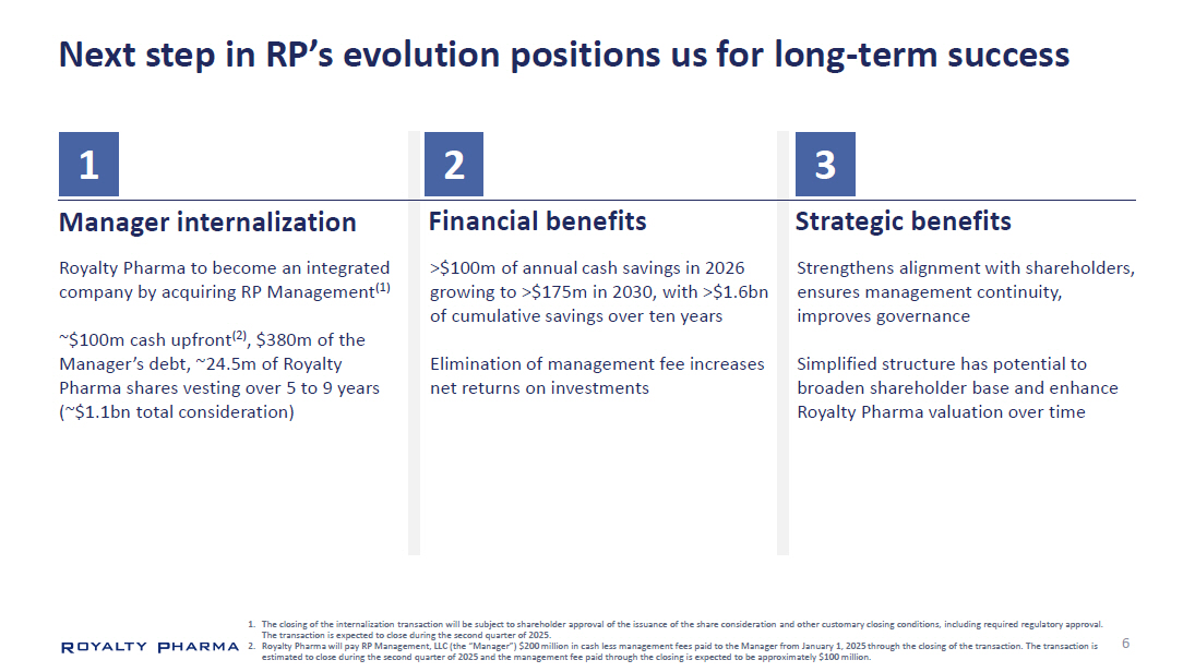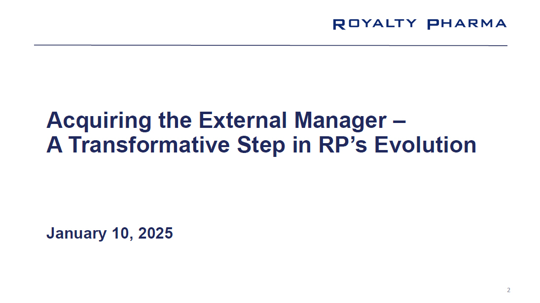 Cautionary Note Regarding Forward - Looking Statements This presentation relates to a proposed acquisition by Royalty Pharma plc (the “Company”) of its external manager, RP Management, LLC (the “Transaction”). The information set forth herein does not purport to be complete or to contain all of the information you may desire. Statements contained herein are made as of the date of this document unless stated otherwise, and neither the delivery of this document at any time, nor any sale of securities, shall under any circumstances create an implication that the information contained herein is correct as of any time after such date or that information will be updated or revised to reflect information that subsequently becomes available or changes occurring after the date hereof. This document contains statements that constitute “forward - looking statements” as that term is defined in the United States Private Securities Litigation Reform Act of 1995, including statements that express the company’s opinions, expectations, beliefs, plans, objectives, assumptions or projections regarding future events or future results, in contrast with statements that reflect historical facts. Examples include discussion of Royalty Pharma’s strategies, financing plans, growth opportunities, market growth, and plans for capital deployment, plus the benefits of the Transaction, including cash savings, enhanced alignment with shareholders, increased investment returns, expectations regarding management continuity, transparency and governance, and the benefits of simplification to its structure. In some cases, you can identify such forward - looking statements by terminology such as “may,” “might,” “will,” “should,” “expects,” “plans,” “anticipates,” “believes,” “estimates,” “target,” “forecast,” “guidance,” “goal,” “predicts,” “project,” “potential” or “continue,” the negative of these terms or similar expressions. Forward - looking statements are based on management’s current beliefs and assumptions and on information currently available to the company. However, these forward - looking statements are not a guarantee of Royalty Pharma’s performance, and you should not place undue reliance on such statements, including because the Transaction is subject to shareholder approval. Forward - looking statements are subject to many risks, uncertainties and other variable circumstances, and other factors. Such risks and uncertainties may cause the statements to be inaccurate and readers are cautioned not to place undue reliance on such statements. Many of these risks are outside of Royalty Pharma’s control and could cause its actual results to differ materially from those it thought would occur. The forward - looking statements included in this document are made only as of the date hereof. Royalty Pharma does not undertake, and specifically declines, any obligation to update any such statements or to publicly announce the results of any revisions to any such statements to reflect future events or developments, except as required by law. For further information, please reference Royalty Pharma’s reports and documents filed with the U.S. Securities and Exchange Commission (“SEC”) by visiting EDGAR on the SEC’s website at www.sec.gov. Additional Information and Where to Find It In connection with the Transaction, Royalty Pharma will file with the SEC a proxy statement on Schedule 14A. The definitive proxy statement will be sent to the stockholders of Royalty Pharma seeking their approval of the Transaction and other related matters. INVESTORS AND SECURITY HOLDERS ARE URGED TO READ THE PROXY STATEMENT ON SCHEDULE 14A WHEN IT BECOMES AVAILABLE, AS WELL AS ANY OTHER RELEVANT DOCUMENTS FILED WITH THE SEC IN CONNECTION WITH THE TRANSACTION OR INCORPORATED BY REFERENCE INTO THE PROXY STATEMENT, BECAUSE THEY WILL CONTAIN IMPORTANT INFORMATION REGARDING ROYALTY PHARMA, THE TRANSACTION AND RELATED MATTERS. Investors and security holders may obtain free copies of these documents, including the proxy statement, and other documents filed with the SEC by the Company through the website maintained by the SEC at https://www.sec.gov/edgar/browse/?CIK=1802768&owner=exclude . Copies of documents filed with the SEC by Royalty Pharma will be made available free of charge by accessing its website at https:// www.royaltypharma.com/investors/ or by contacting Royalty Pharma via email by sending a message to ir@royaltypharma.com. 3