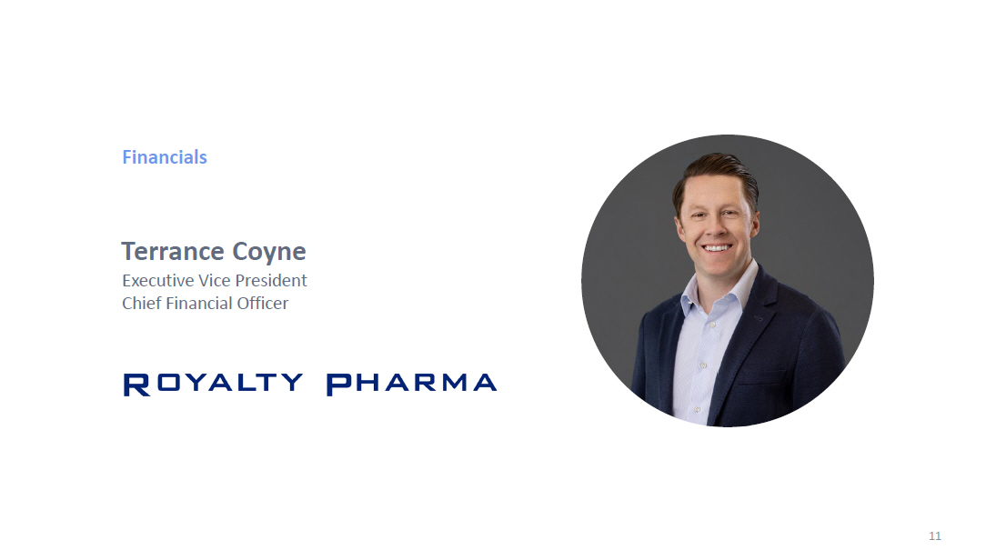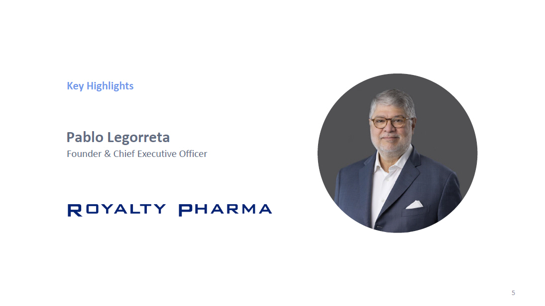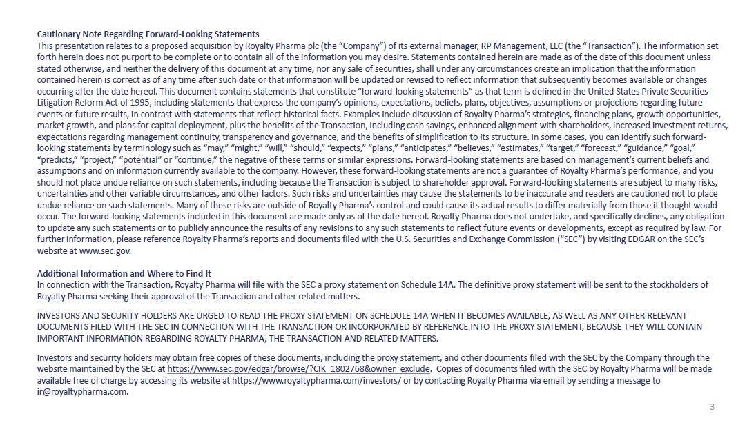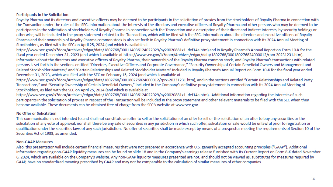 Participants in the Solicitation Royalty Pharma and its directors and executive officers may be deemed to be participants in the solicitation of proxies from the stockholders of Royalty Pharma in connection with the Transaction under the rules of the SEC. Information about the interests of the directors and executive officers of Royalty Pharma and other persons who may be deemed to be participants in the solicitation of stockholders of Royalty Pharma in connection with the Transaction and a description of their direct and indirect interests, by security holdings or otherwise, will be included in the proxy statement related to the Transaction, which will be filed with the SEC. Information about the directors and executive officers of Royalty Pharma and their ownership of Royalty Pharma common stock is also set forth in Royalty Pharma’s definitive proxy statement in connection with its 2024 Annual Meeting of Stockholders, as filed with the SEC on April 25, 2024 (and which is available at https://www.sec.gov/ix?doc=/Archives/edgar/data/1802768/000114036124022029/ny20020881x1_def14a.htm) and in Royalty Pharma’s Annual Report on Form 10 - K for the fiscal year ended December 31, 2023 (and which is available at https://www.sec.gov/ix?doc=/Archives/edgar/data/1802768/000180276824000012/rprx - 20231231.htm). Information about the directors and executive officers of Royalty Pharma, their ownership of the Royalty Pharma common stock, and Royalty Pharma’s transactions with related persons is set forth in the sections entitled “Directors, Executive Officers and Corporate Governance,” “Security Ownership of Certain Beneficial Owners and Management and Related Stockholder Matters,” and “Certain Relationships and Related Stockholder Matters” included in Royalty Pharma’s Annual Report on Form 10 - K for the fiscal year ended December 31, 2023, which was filed with the SEC on February 15, 2024 (and which is available at https://www.sec.gov/ix?doc=/Archives/edgar/data/1802768/000180276824000012/rprx - 20231231.htm), and in the sections entitled “Certain Relationships and Related Party Transactions,” and “Security Ownership of Certain Beneficial Owners,” included in the Company’s definitive proxy statement in connection with its 2024 Annual Meeting of Stockholders, as filed with the SEC on April 25, 2024 (and which is available at https://www.sec.gov/ix?doc=/Archives/edgar/data/1802768/000114036124022029/ny20020881x1_def14a.htm). Additional information regarding the interests of such participants in the solicitation of proxies in respect of the Transaction will be included in the proxy statement and other relevant materials to be filed with the SEC when they become available. These documents can be obtained free of charge from the SEC’s website at www.sec.gov. No Offer or Solicitation This communication is not intended to and shall not constitute an offer to sell or the solicitation of an offer to sell or the solicitation of an offer to buy any securities or the solicitation of any vote of approval, nor shall there be any sale of securities in any jurisdiction in which such offer, solicitation or sale would be unlawful prior to registration or qualification under the securities laws of any such jurisdiction. No offer of securities shall be made except by means of a prospectus meeting the requirements of Section 10 of the Securities Act of 1933, as amended. Non - GAAP Measures Also, this presentation will include certain financial measures that were not prepared in accordance with U.S. generally accepted accounting principles (“GAAP”). Additional information regarding non - GAAP liquidity measures can be found on slide 18 and in the Company’s earnings release furnished with its Current Report on Form 8 - K dated November 6, 2024, which are available on the Company’s website. Any non - GAAP liquidity measures presented are not, and should not be viewed as, substitutes for measures required by GAAP, have no standardized meaning prescribed by GAAP and may not be comparable to the calculation of similar measures of other companies. 4