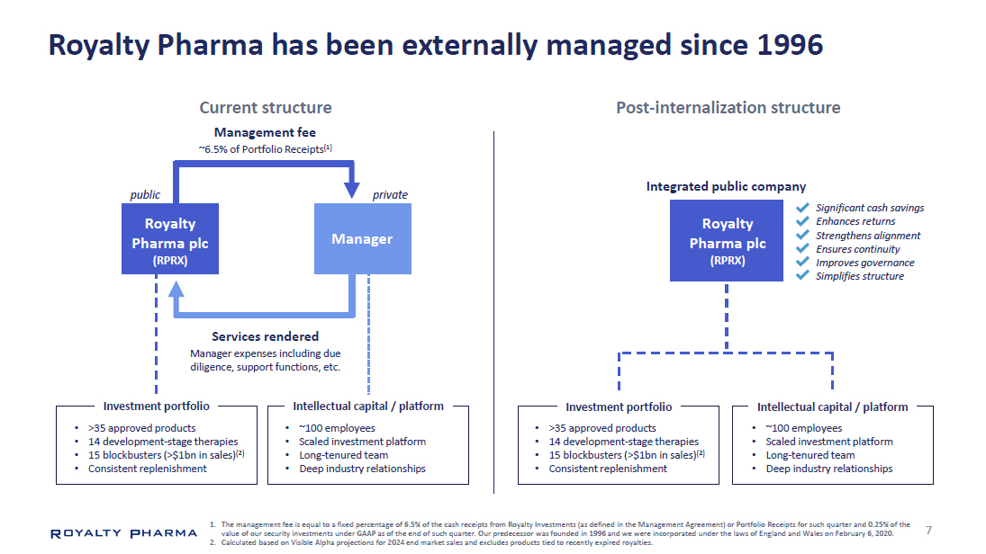 Next step in RP’s evolution positions us for long - term success 6 1. The closing of the internalization transaction will be subject to shareholder approval of the issuance of the share consideration and other customary closing conditions, including required regulatory approval. The transaction is expected to close during the second quarter of 2025. 2. Royalty Pharma will pay RP Management, LLC (the “Manager”) $200 million in cash less management fees paid to the Manager from January 1, 2025 through the closing of the transaction. The transaction is estimated to close during the second quarter of 2025 and the management fee paid through the closing is expected to be approximately $100 million. ~$100m cash upfront (2) , $380m of the Manager’s debt, ~24.5m of Royalty Pharma shares vesting over 5 to 9 years (~$1.1bn total consideration) Manager internalization Royalty Pharma to become an integrated company by acquiring RP Management (1) 1 Elimination of management fee increases net returns on investments Financial benefits >$100m of annual cash savings in 2026 growing to >$175m in 2030, with >$1.6bn of cumulative savings over ten years 1 2 3 Strengthens alignment with shareholders, ensures management continuity, improves governance Simplified structure has potential to broaden shareholder base and enhance Royalty Pharma valuation over time Strategic benefits