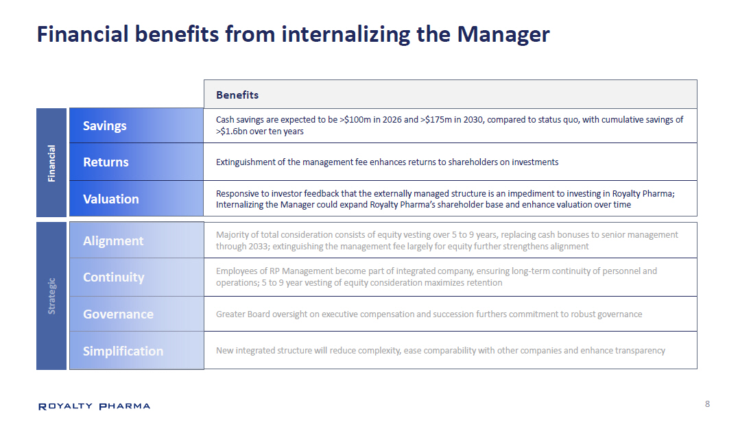 7 Royalty Pharma has been externally managed since 1996 1. The management fee is equal to a fixed percentage of 6.5% of the cash receipts from Royalty Investments (as defined in the Management Agreement) or Portfolio Receipts for such quarter and 0.25% of the value of our security investments under GAAP as of the end of such quarter. Our predecessor was founded in 1996 and we were incorporated under the laws of England and Wales on February 6, 2020. 2. Calculated based on Visible Alpha projections for 2024 end market sales and excludes products tied to recently expired royalties. Post - internalization structure Current structure Management fee ~6.5% of Portfolio Receipts (1) ager Investment portfolio Intellectual capital / platform • ~100 employees • Scaled investment platform • Long - tenured team • Deep industry relationships Royalty Pharma plc (RPRX) Investment portfolio • ~100 employees • Scaled investment platform • Long - tenured team • Deep industry relationships Integrated public company public Man Royalty Pharma plc (RPRX) Services rendered Manager expenses including due diligence, support functions, etc. Intellectual capital / platform p r i v a t e • >35 approved products • 14 development - stage therapies • 15 blockbusters (>$1bn in sales) (2) • Consistent replenishment • >35 approved products • 14 development - stage therapies • 15 blockbusters (>$1bn in sales) (2) • Consistent replenishment Significant cash savings Enhances returns Strengthens alignment Ensures continuity Improves governance Simplifies structure
