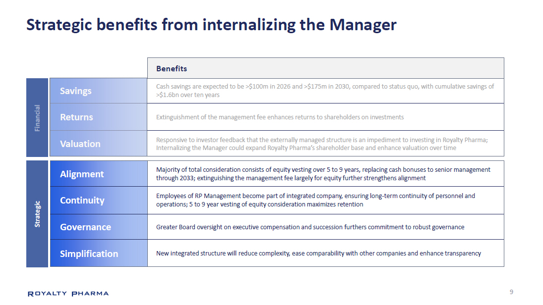 8 Financial benefits from internalizing the Manager Alignment Continuity Governance Sim p lifi c a t i on Benefits Cash savings are expected to be >$100m in 2026 and >$175m in 2030, compared to status quo, with cumulative savings of >$1.6bn over ten years Savings Extinguishment of the management fee enhances returns to shareholders on investments Returns Responsive to investor feedback that the externally managed structure is an impediment to investing in Royalty Pharma; Internalizing the Manager could expand Royalty Pharma’s shareholder base and enhance valuation over time Valuation Financial gi c e t a r St Majority of total consideration consists of equity vesting over 5 to 9 years, replacing cash bonuses to senior management through 2033; extinguishing the management fee largely for equity further strengthens alignment Employees of RP Management become part of integrated company, ensuring long - term continuity of personnel and operations; 5 to 9 year vesting of equity consideration maximizes retention Greater Board oversight on executive compensation and succession furthers commitment to robust governance New integrated structure will reduce complexity, ease comparability with other companies and enhance transparency