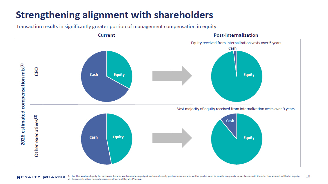 9 Strategic benefits from internalizing the Manager Majority of total consideration consists of equity vesting over 5 to 9 years, replacing cash bonuses to senior management through 2033; extinguishing the management fee largely for equity further strengthens alignment Alignment Employees of RP Management become part of integrated company, ensuring long - term continuity of personnel and operations; 5 to 9 year vesting of equity consideration maximizes retention Continuity Greater Board oversight on executive compensation and succession furthers commitment to robust governance Governance New integrated structure will reduce complexity, ease comparability with other companies and enhance transparency Simplification Savings Returns V alu a ti o n nc ial n a i F Strategic Benefits Cash savings are expected to be >$100m in 2026 and >$175m in 2030, compared to status quo, with cumulative savings of >$1.6bn over ten years Extinguishment of the management fee enhances returns to shareholders on investments Responsive to investor feedback that the externally managed structure is an impediment to investing in Royalty Pharma; Internalizing the Manager could expand Royalty Pharma’s shareholder base and enhance valuation over time