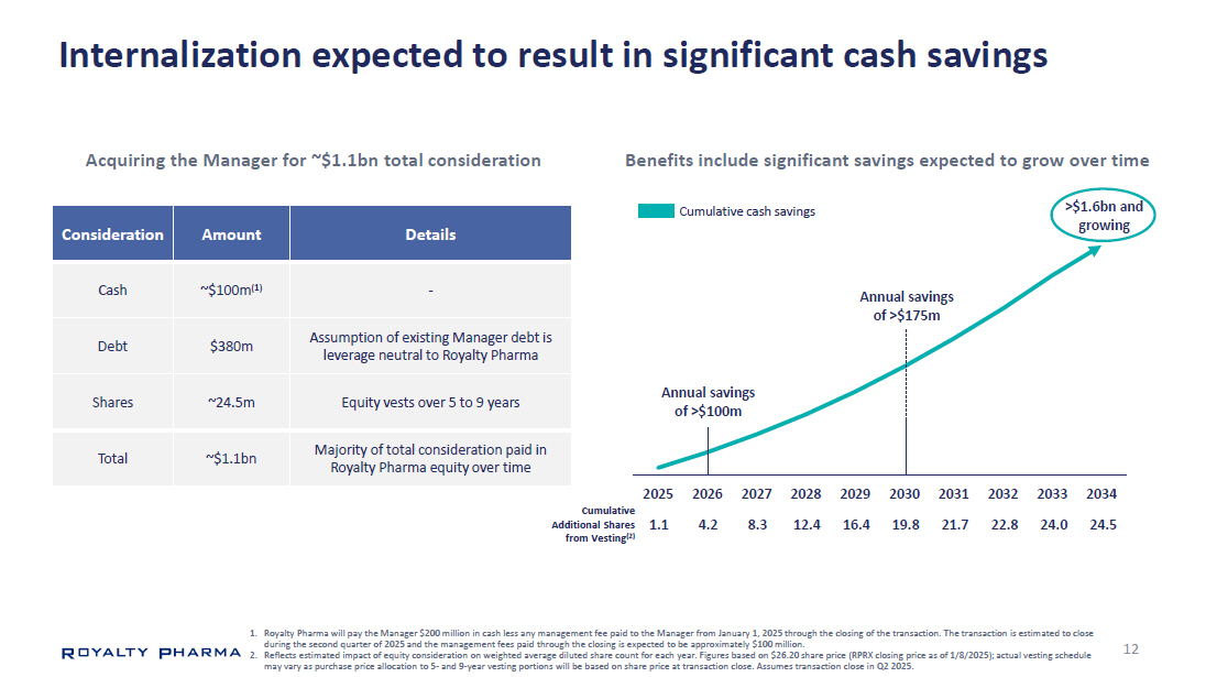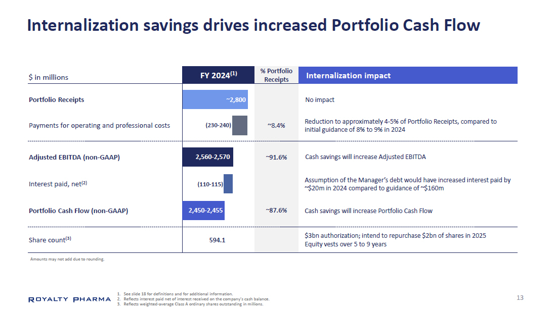 12 Internalization expected to result in significant cash savings Benefits include significant savings expected to grow over time Cumulative cash savings >$1.6bn and growing Annual savings of >$100m Equity vesting ends 2 0 2 5 2 0 26 2 0 27 2 0 28 2 0 29 2 0 30 2 0 31 2 0 32 2 0 33 2 0 34 Deferred equity payments begins 1. Royalty Pharma will pay the Manager $200 million in cash less any management fee paid to the Manager from January 1, 2025 through the closing of the transaction. The transaction is estimated to close during the second quarter of 2025 and the management fee paid through the closing is expected to be approximately $100 million. Details Amount Consideration - ~$100m (1) Cash Assumption of existing Manager debt is leverage neutral to Royalty Pharma $380m Debt Equity vests over 5 to 9 years ~24.5m Shares Majority of total consideration paid in Royalty Pharma equity over time ~$1.1bn Total Acquiring the Manager for ~$1.1bn total consideration Annual savings of >$175m