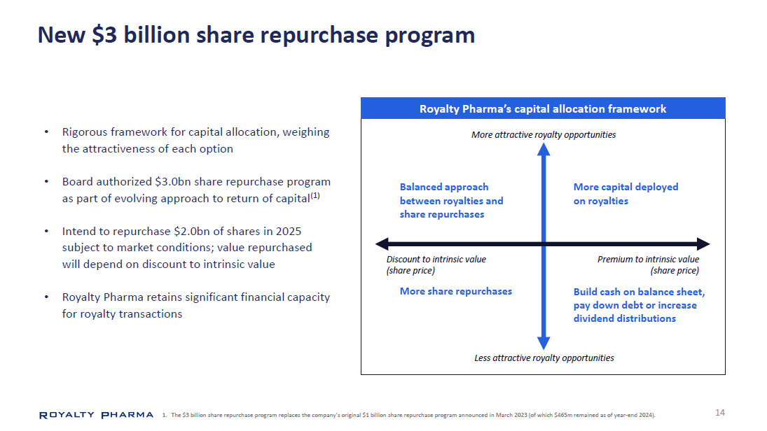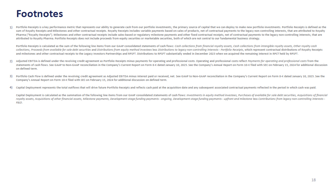 F ootno t es Portfolio Receipts is a key performance metric that represents our ability to generate cash from our portfolio investments, the primary source of capital that we can deploy to make new portfolio investments. Portfolio Receipts is defined as the sum of Royalty Receipts and Milestones and other contractual receipts. Royalty Receipts includes variable payments based on sales of products, net of contractual payments to the legacy non - controlling interests, that are attributed to Royalty Pharma (“Royalty Receipts”). Milestones and other contractual receipts include sales - based or regulatory milestone payments and other fixed contractual receipts, net of contractual payments to the legacy non - controlling interests, that are attributed to Royalty Pharma. Portfolio Receipts does not include proceeds from equity securities or marketable securities, both of which are not central to our fundamental business strategy. Capital Deployment represents the total outflows that will drive future Portfolio Receipts and reflects cash paid at the acquisition date and any subsequent associated contractual payments reflected in the period in which cash was paid. Capital Deployment is calculated as the summation of the following line items from our GAAP consolidated statements of cash flows: Investments in equity method investees, Purchases of available for sale debt securities, Acquisitions of financial royalty assets, Acquisitions of other financial assets, Milestone payments, Development - stage funding payments - ongoing, Development - stage funding payments - upfront and milestone less Contributions from legacy non - controlling interests - R&D . 1) Portfolio Receipts is calculated as the sum of the following line items from our GAAP consolidated statements of cash flows: Cash collections from financial royalty assets, Cash collections from intangible royalty assets, Other royalty cash collections, Proceeds from available for sale debt securities and Distributions from equity method investees less Distributions to legacy non - controlling interests - Portfolio Receipts , which represent contractual distributions of Royalty Receipts and milestones and other contractual receipts to the Legacy Investors Partnerships and RPSFT. Distributions to RPSFT substantially ended in December 2023 when we acquired the remaining interest in RPCT held by RPSFT. 2) Adjusted EBITDA is defined under the revolving credit agreement as Portfolio Receipts minus payments for operating and professional costs. Operating and professional costs reflect Payments for operating and professional costs from the statements of cash flows. See GAAP to Non - GAAP reconciliation in the Company’s Current Report on Form 8 - K dated January 10, 2025. See the Company’s Annual Report on Form 10 - K filed with SEC on February 15, 2024 for additional discussion on defined term. 3) Portfolio Cash Flow is defined under the revolving credit agreement as Adjusted EBITDA minus interest paid or received, net. See GAAP to Non - GAAP reconciliation in the Company’s Current Report on Form 8 - K dated January 10, 2025. See the Company’s Annual Report on Form 10 - K filed with SEC on February 15, 2024 for additional discussion on defined term. 4) 18