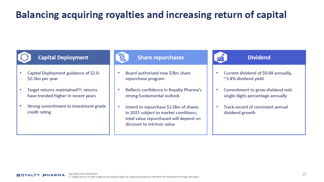 New $3 billion share repurchase program 14 • Rigorous framework for capital allocation, weighing the attractiveness of each option • Board authorized $3.0bn share repurchase program as part of evolving approach to return of capital (1) • Intend to repurchase $2.0bn of shares in 2025 subject to market conditions; value repurchased will depend on discount to intrinsic value • Royalty Pharma retains significant financial capacity for royalty transactions Royalty Pharma’s capital allocation framework 1. The $3 billion share repurchase program replaces the company’s original $1 billion share repurchase program announced in March 2023 (of which $465m remained as of year - end 2024). Royalty Pharma’s capital allocation framework Discount to intrinsic value (share price) Premium to intrinsic value (share price) Less attractive royalty opportunities More attractive royalty opportunities More share repurchases Build cash on balance sheet, pay down debt or increase dividend distributions More capital deployed on royalties Balanced approach between royalties and share repurchases