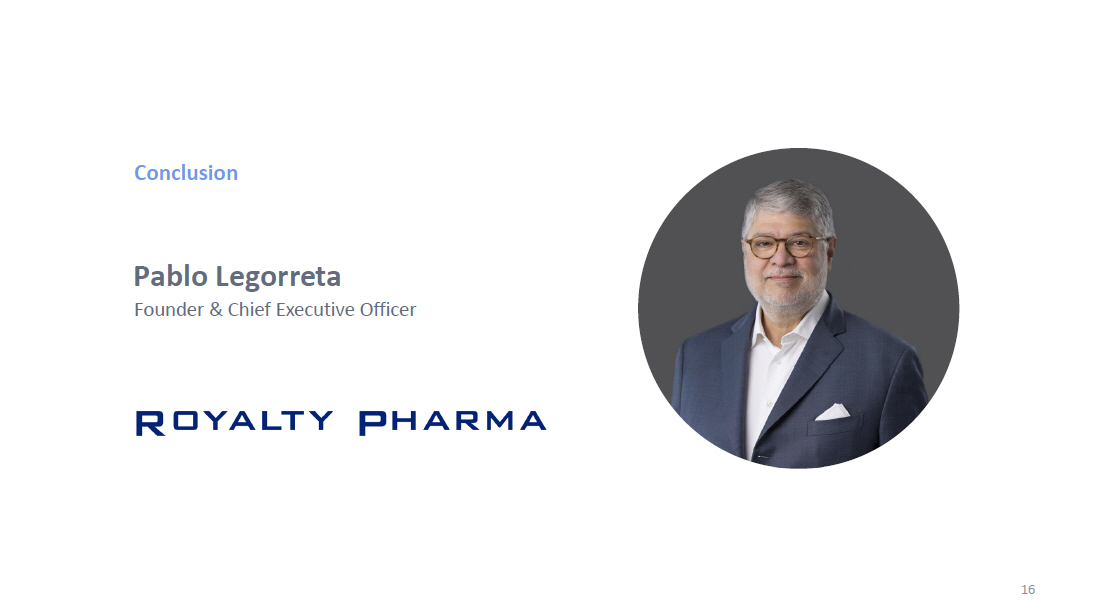 15 Balancing acquiring royalties and increasing return of capital Capital Deployment Share repurchases Dividend • Board authorized new $3bn share repurchase program • Reflects confidence in Royalty Pharma’s strong fundamental outlook • Intend to repurchase $2.0bn of shares in 2025 subject to market conditions; total value repurchased will depend on discount to intrinsic value • Capital Deployment guidance of $2.0 - $2.5bn per year • Target returns maintained (1) ; returns have trended higher in recent years • Strong commitment to investment grade credit rating • Current dividend of $0.88 annually, ~3.4% dividend yield • Commitment to grow dividend mid - single digits percentage annually • Track - record of consistent annual dividend growth See slide 18 for definitions 1. Target returns of high - single to low - double digits for approved products and teens for development - stage therapies.