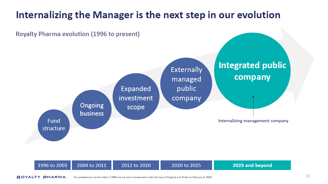 17 Internalizing the Manager is the next step in our evolution Ongoing business Integrated public company Fund s t r uc t u r e 1996 to 2003 2025 and beyond E x t ernally managed public company Expanded i n v e s tm e n t scope Royalty Pharma evolution (1996 to present) Internalizing management company 2004 to 2011 2012 to 2020 2020 to 2025 Our predecessor was founded in 1996 and we were incorporated under the laws of England and Wales on February 6, 2020.