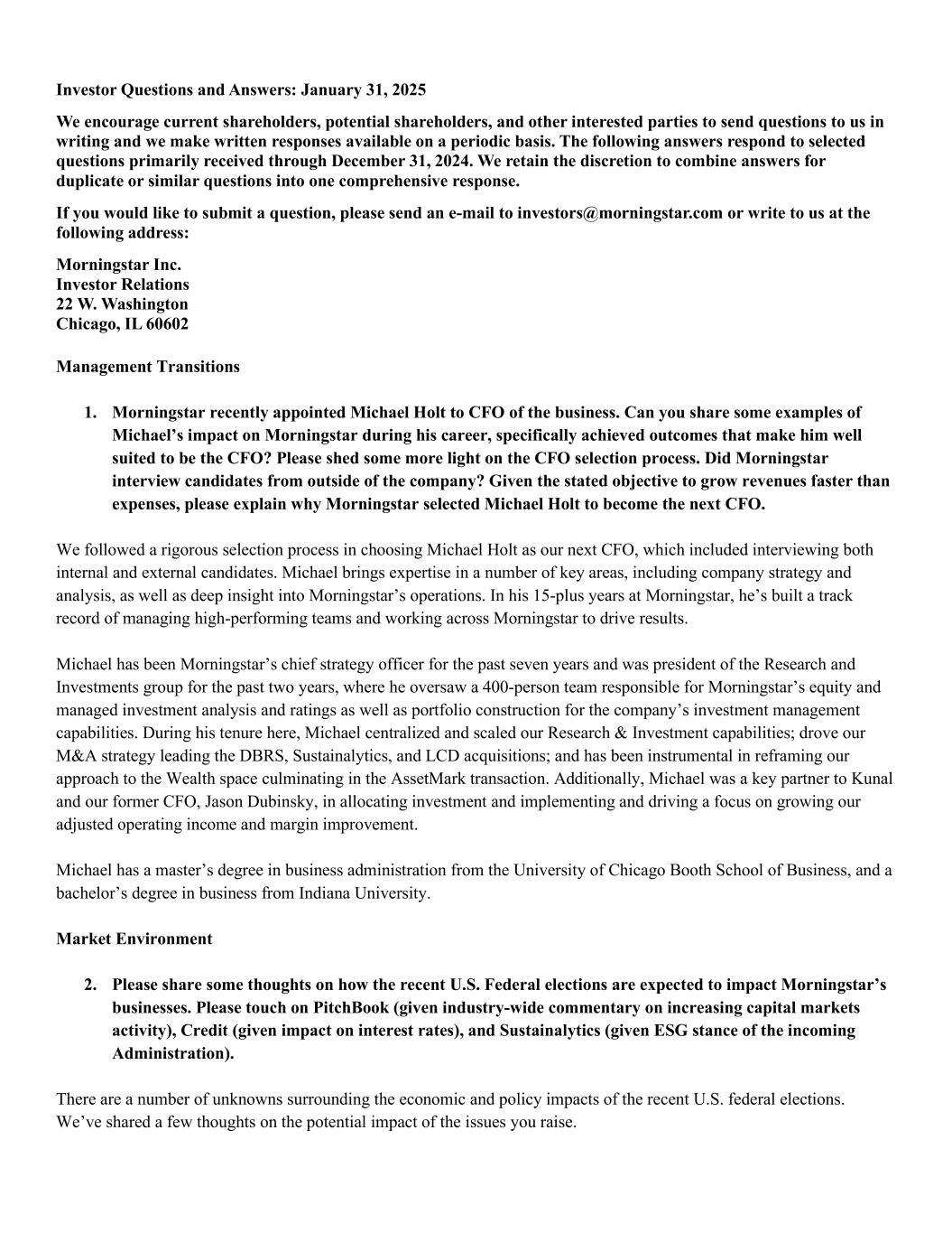 Investor Questions and Answers: January 31, 2025 We encourage current shareholders, potential shareholders, and other interested parties to send questions to us in writing and we make written responses available on a periodic basis. The following answers respond to selected questions primarily received through December 31, 2024. We retain the discretion to combine answers for duplicate or similar questions into one comprehensive response. If you would like to submit a question, please send an e-mail to investors@morningstar.com or write to us at the following address: Morningstar Inc. Investor Relations 22 W. Washington Chicago, IL 60602 Management Transitions 1. Morningstar recently appointed Michael Holt to CFO of the business. Can you share some examples of Michael’s impact on Morningstar during his career, specifically achieved outcomes that make him well suited to be the CFO? Please shed some more light on the CFO selection process. Did Morningstar interview candidates from outside of the company? Given the stated objective to grow revenues faster than expenses, please explain why Morningstar selected Michael Holt to become the next CFO. We followed a rigorous selection process in choosing Michael Holt as our next CFO, which included interviewing both internal and external candidates. Michael brings expertise in a number of key areas, including company strategy and analysis, as well as deep insight into Morningstar’s operations. In his 15-plus years at Morningstar, he’s built a track record of managing high-performing teams and working across Morningstar to drive results. Michael has been Morningstar’s chief strategy officer for the past seven years and was president of the Research and Investments group for the past two years, where he oversaw a 400-person team responsible for Morningstar’s equity and managed investment analysis and ratings as well as portfolio construction for the company’s investment management capabilities. During his tenure here, Michael centralized and scaled our Research & Investment capabilities; drove our M&A strategy leading the DBRS, Sustainalytics, and LCD acquisitions; and has been instrumental in reframing our approach to the Wealth space culminating in the AssetMark transaction. Additionally, Michael was a key partner to Kunal and our former CFO, Jason Dubinsky, in allocating investment and implementing and driving a focus on growing our adjusted operating income and margin improvement. Michael has a master’s degree in business administration from the University of Chicago Booth School of Business, and a bachelor’s degree in business from Indiana University. Market Environment 2. Please share some thoughts on how the recent U.S. Federal elections are expected to impact Morningstar’s businesses. Please touch on PitchBook (given industry-wide commentary on increasing capital markets activity), Credit (given impact on interest rates), and Sustainalytics (given ESG stance of the incoming Administration). There are a number of unknowns surrounding the economic and policy impacts of the recent U.S. federal elections. We’ve shared a few thoughts on the potential impact of the issues you raise.