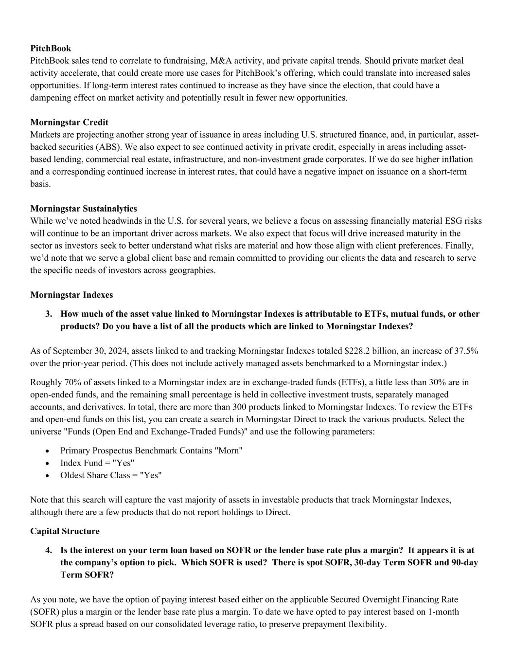 PitchBook PitchBook sales tend to correlate to fundraising, M&A activity, and private capital trends. Should private market deal activity accelerate, that could create more use cases for PitchBook’s offering, which could translate into increased sales opportunities. If long-term interest rates continued to increase as they have since the election, that could have a dampening effect on market activity and potentially result in fewer new opportunities. Morningstar Credit Markets are projecting another strong year of issuance in areas including U.S. structured finance, and, in particular, asset- backed securities (ABS). We also expect to see continued activity in private credit, especially in areas including asset- based lending, commercial real estate, infrastructure, and non-investment grade corporates. If we do see higher inflation and a corresponding continued increase in interest rates, that could have a negative impact on issuance on a short-term basis. Morningstar Sustainalytics While we’ve noted headwinds in the U.S. for several years, we believe a focus on assessing financially material ESG risks will continue to be an important driver across markets. We also expect that focus will drive increased maturity in the sector as investors seek to better understand what risks are material and how those align with client preferences. Finally, we’d note that we serve a global client base and remain committed to providing our clients the data and research to serve the specific needs of investors across geographies. Morningstar Indexes 3. How much of the asset value linked to Morningstar Indexes is attributable to ETFs, mutual funds, or other products? Do you have a list of all the products which are linked to Morningstar Indexes? As of September 30, 2024, assets linked to and tracking Morningstar Indexes totaled $228.2 billion, an increase of 37.5% over the prior-year period. (This does not include actively managed assets benchmarked to a Morningstar index.) Roughly 70% of assets linked to a Morningstar index are in exchange-traded funds (ETFs), a little less than 30% are in open-ended funds, and the remaining small percentage is held in collective investment trusts, separately managed accounts, and derivatives. In total, there are more than 300 products linked to Morningstar Indexes. To review the ETFs and open-end funds on this list, you can create a search in Morningstar Direct to track the various products. Select the universe "Funds (Open End and Exchange-Traded Funds)" and use the following parameters: • Primary Prospectus Benchmark Contains "Morn" • Index Fund = "Yes" • Oldest Share Class = "Yes" Note that this search will capture the vast majority of assets in investable products that track Morningstar Indexes, although there are a few products that do not report holdings to Direct. Capital Structure 4. Is the interest on your term loan based on SOFR or the lender base rate plus a margin? It appears it is at the company’s option to pick. Which SOFR is used? There is spot SOFR, 30-day Term SOFR and 90-day Term SOFR? As you note, we have the option of paying interest based either on the applicable Secured Overnight Financing Rate (SOFR) plus a margin or the lender base rate plus a margin. To date we have opted to pay interest based on 1-month SOFR plus a spread based on our consolidated leverage ratio, to preserve prepayment flexibility.