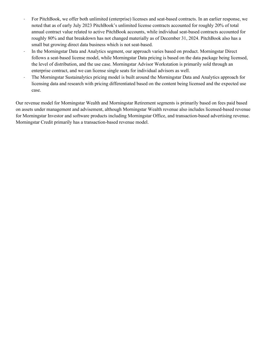 - For PitchBook, we offer both unlimited (enterprise) licenses and seat-based contracts. In an earlier response, we noted that as of early July 2023 PitchBook’s unlimited license contracts accounted for roughly 20% of total annual contract value related to active PitchBook accounts, while individual seat-based contracts accounted for roughly 80% and that breakdown has not changed materially as of December 31, 2024. PitchBook also has a small but growing direct data business which is not seat-based. - In the Morningstar Data and Analytics segment, our approach varies based on product. Morningstar Direct follows a seat-based license model, while Morningstar Data pricing is based on the data package being licensed, the level of distribution, and the use case. Morningstar Advisor Workstation is primarily sold through an enterprise contract, and we can license single seats for individual advisors as well. - The Morningstar Sustainalytics pricing model is built around the Morningstar Data and Analytics approach for licensing data and research with pricing differentiated based on the content being licensed and the expected use case. Our revenue model for Morningstar Wealth and Morningstar Retirement segments is primarily based on fees paid based on assets under management and advisement, although Morningstar Wealth revenue also includes licensed-based revenue for Morningstar Investor and software products including Morningstar Office, and transaction-based advertising revenue. Morningstar Credit primarily has a transaction-based revenue model.